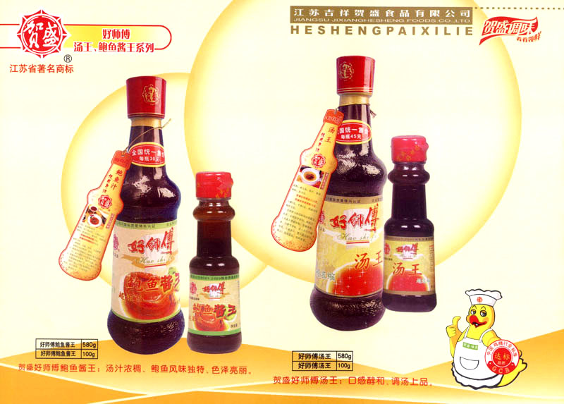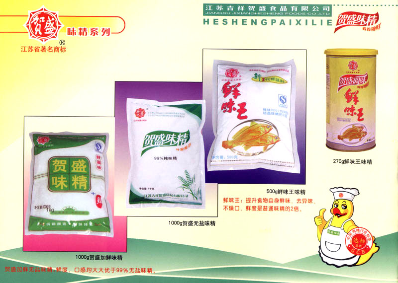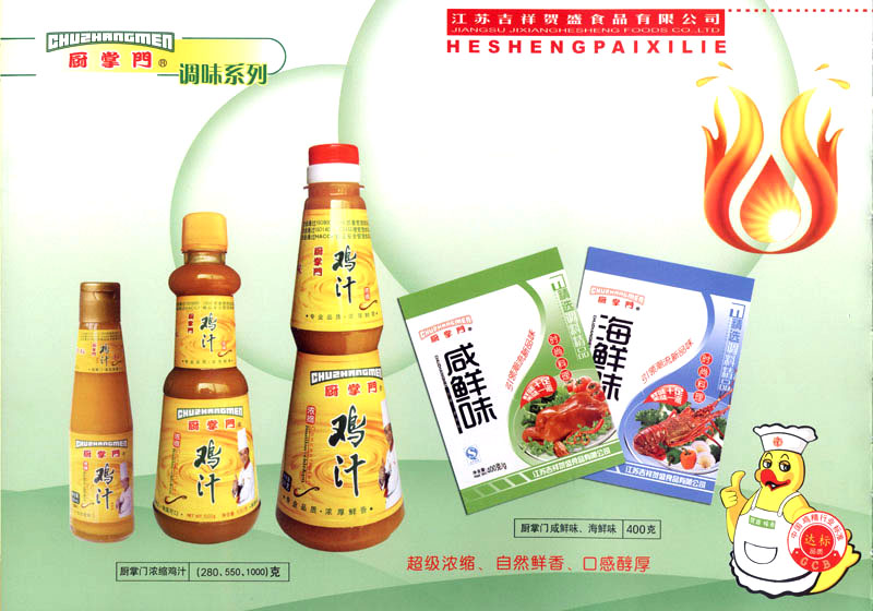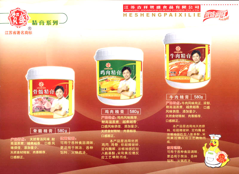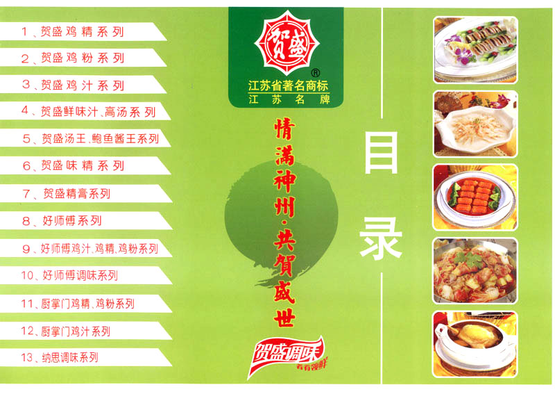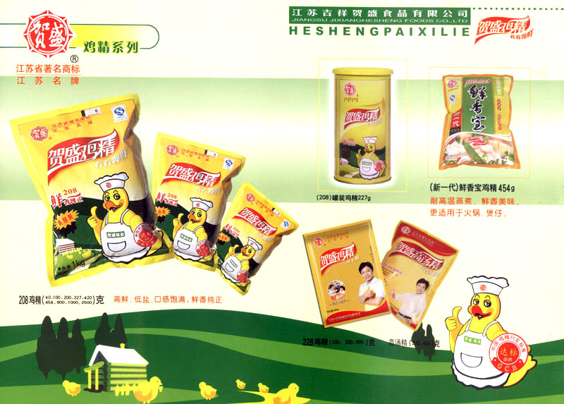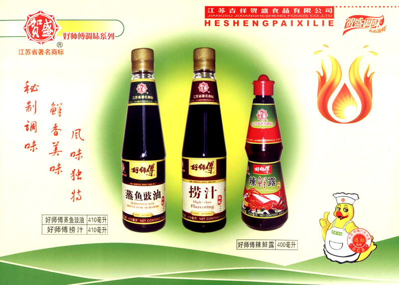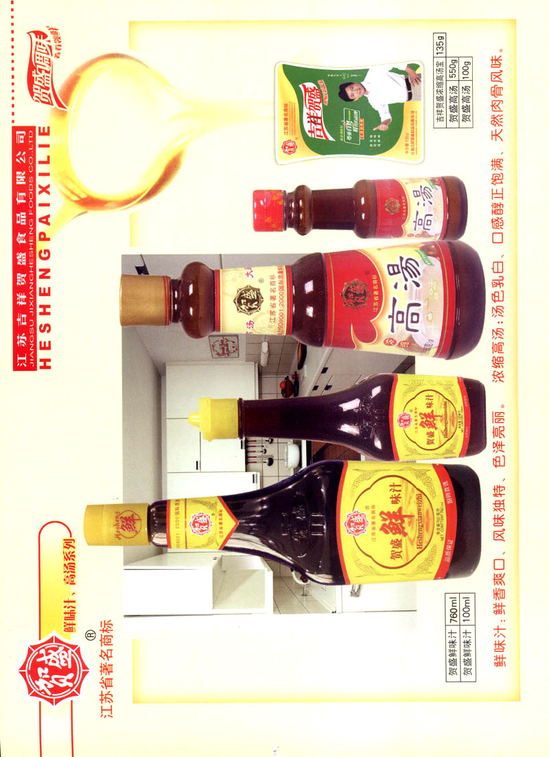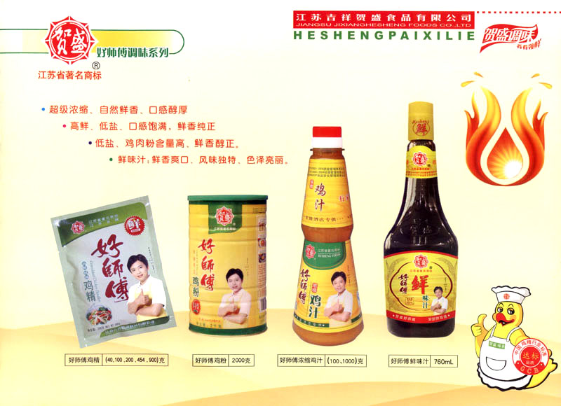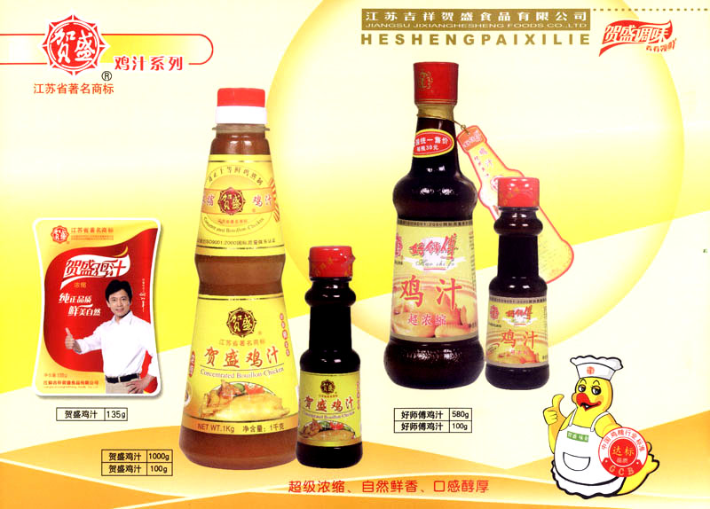 江蘇吉祥賀盛食品有限公司是一家中國專業(yè)餐料知名制造商,公司座落在經濟高度發(fā)達“長三角”的常州市,緊靠312國道,滬寧高速與沿江高速交匯處,距常州火車站及長江水運碼頭20千米,交通十分便利。公司占地面積23500平方米,花園式工廠、廠房面積18500平方米,現在員工330余名,其中擁有中、高級職稱管理和技術人員58名,生產場地均按食品和藥品GMP要求設計、全封閉車間、中央空調系統、閉路電視監(jiān)控系統。目前已建成成三條雞精,雞粉生產線。一條雞汁生產線。一條鮮味汁生產線。一條醬汁精膏類生產線,規(guī)劃年生產能力達30000噸。 “賀盛”品牌取自《詩·大雅·下武》中“受天之祜、 四方來賀”;《易經》中“富有謂之大業(yè),日新之謂盛德”,賀盛企業(yè)師法源遠流長中華飲食文化,融匯中西健康美食調味。相繼研發(fā)生產出高品質的“賀盛牌”味精、雞精、雞粉、雞汁、湯王、鮑魚醬王、鮮味汁調味素和各種風味熱反應精膏等系列產品。二十年來“賀盛”產品質量獲得廚藝界專業(yè)人士和消費者的一致好評和高度認可。 賀盛企業(yè)和產品相繼榮獲1995年“首界中國國際食品博覽會金獎”,2001年企業(yè)通過ISO-9001國際質量體系認證,2003年江蘇省“計量保證確認單位”,2004年獲得自營出口權,2005年賀盛雞精榮獲“江蘇名牌產品”,2006年賀盛商標被評為“江蘇省著名商標”,2007年通過HACCP認證,全部產品均通過QS食品安全認證,并積極努力爭創(chuàng)中國名牌,中國馳名商標。 公司銷售網點建設發(fā)展迅速,相繼組建上海、南京、河南、海南、新疆全資分公司;辦事處、經銷商覆蓋全國,并出口日本、香港及東南亞地區(qū)。二十年來,在公司總裁周國林先生帶領下,全體同仁秉承“厚德載物、自強不息”宗旨,發(fā)揚“以人為本、科技創(chuàng)新、自我加壓、爭創(chuàng)一流”的企求精神;致力于傳承中華飲食文化,融化西方美食精粹,不斷的研發(fā)、創(chuàng)新,奉獻更多更好的調味料,讓生活更有滋味。公司總裁周國林先生攜全體員工熱誠歡迎各位新老朋友蒞臨指導,洽談合作!