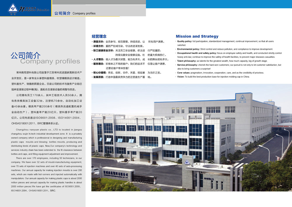 常州南苑塑料有限公司是一家專業(yè)從事塑料蓋模具、吹塑桶模具設(shè)計(jì)制造及塑料蓋產(chǎn)品生產(chǎn)和銷售的民營企業(yè)。公司創(chuàng)建于1991年,總投資8000萬元,擁有工程技術(shù)人員50余人,品質(zhì)管理人員20余人;各類注塑設(shè)備70余臺套。模具加工設(shè)備40余臺套,模具年產(chǎn)能200余付,塑料蓋年產(chǎn)能20億只,塑料提手年產(chǎn)能20億只。產(chǎn)品涉及潤滑油、食品和保健品行業(yè)。主要客戶有:中石化、中石油、道達(dá)爾、埃爾夫、景田、怡寶、農(nóng)夫山泉等知名品牌的生產(chǎn)商!