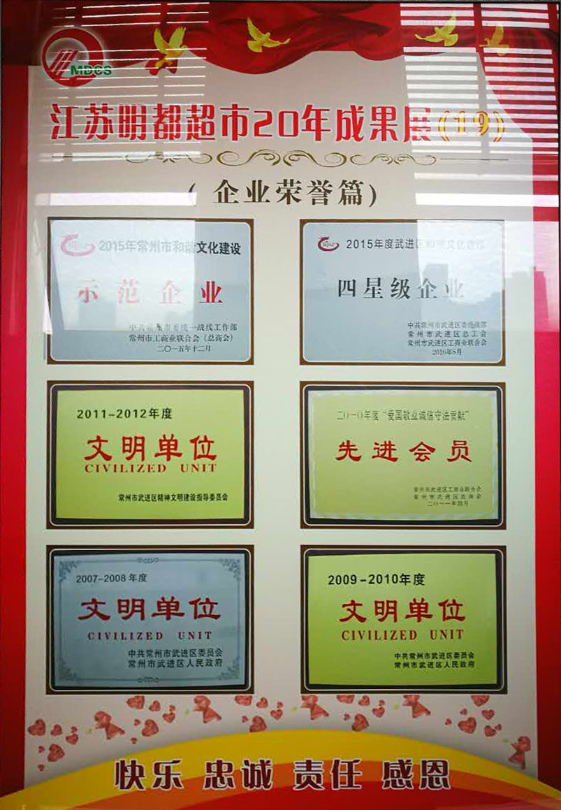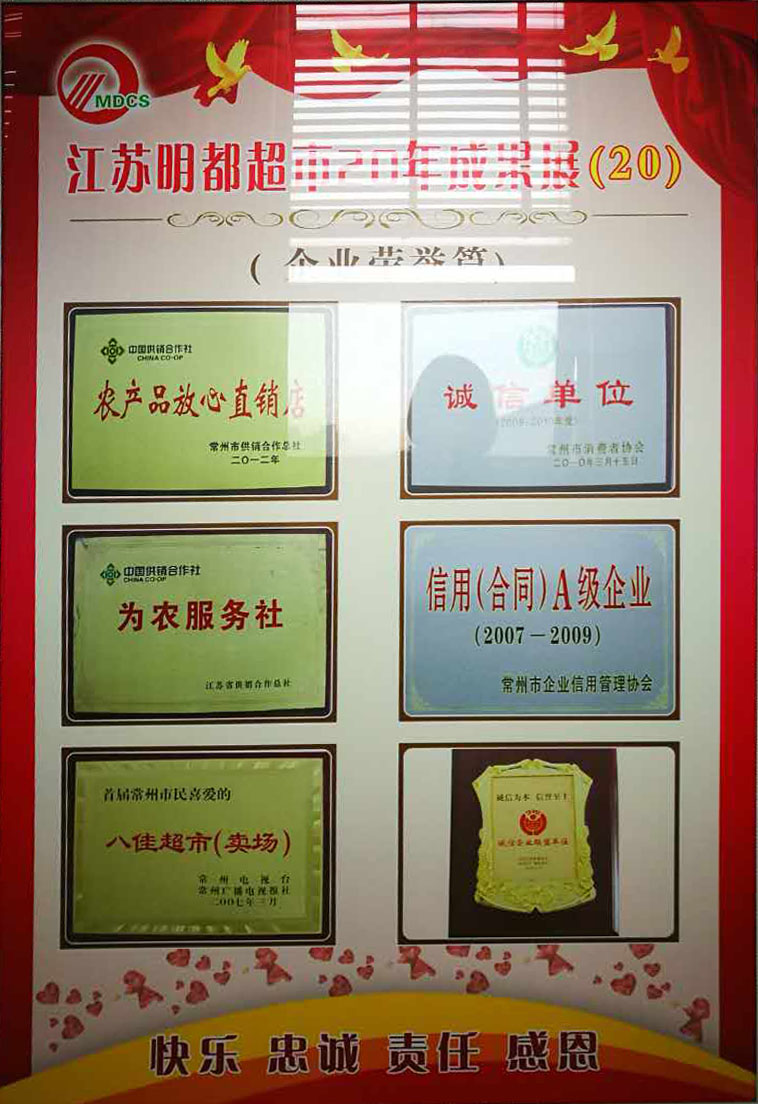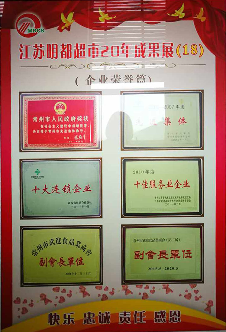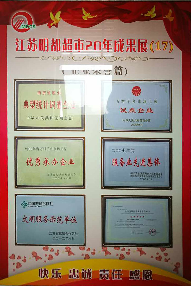 多年來(lái),明都超市從單體商場(chǎng)運(yùn)作到農(nóng)村連鎖經(jīng)營(yíng),從加盟品牌入手到自主創(chuàng)新品牌,成功實(shí)踐了立足農(nóng)村、走進(jìn)社區(qū)、輻射周邊的發(fā)展戰(zhàn)略,牢固確立了以百姓生活用品為主的連鎖經(jīng)營(yíng)業(yè)態(tài)。堅(jiān)持為民服務(wù)方向,積極推進(jìn)農(nóng)超對(duì)接經(jīng)銷(xiāo)各類(lèi)農(nóng)副產(chǎn)品。為了保持良好的發(fā)展勢(shì)頭,明都超市堅(jiān)持“統(tǒng)一采購(gòu)、統(tǒng)一配送、統(tǒng)一形象、統(tǒng)一核算、統(tǒng)一管理”的連鎖經(jīng)營(yíng)模式;以大批量、大面積、大規(guī)模直接從廠方進(jìn)貨的方式,取得質(zhì)優(yōu)價(jià)廉的商品;堅(jiān)持“品質(zhì)第一,追求卓越”的質(zhì)量承諾;努力實(shí)踐“將更多的實(shí)惠讓給消費(fèi)者”的價(jià)格方針;始終不渝地將“滿(mǎn)足消費(fèi)者的需求”作為最終目標(biāo)。在城鄉(xiāng)市場(chǎng)和廣大消費(fèi)者心中樹(shù)立了良好的口碑和聲譽(yù)。多年來(lái),公司取得了多項(xiàng)榮譽(yù),先后被評(píng)為:武進(jìn)區(qū)服務(wù)業(yè)先進(jìn)單位,武進(jìn)區(qū)十大流通服務(wù)先進(jìn)企業(yè),區(qū)級(jí)納稅大戶(hù)。2006年—2007年獲得江蘇省供銷(xiāo)社、常州市供銷(xiāo)社系統(tǒng)先進(jìn)集體、三星級(jí)為農(nóng)服務(wù)社,2005年—2008價(jià)格A級(jí)誠(chéng)信單位,消費(fèi)、計(jì)量、質(zhì)量誠(chéng)信單位、文明單位,2007年—2010年信用(合同)A級(jí)企業(yè),2007年“百城萬(wàn)店”無(wú)假貨示范店、市民評(píng)選八佳超市,2006年獲得國(guó)家商務(wù)部“萬(wàn)村千鄉(xiāng)”市場(chǎng)工程試點(diǎn)企業(yè)及優(yōu)秀承辦企業(yè),2008年省放心消費(fèi)者示范單位等多項(xiàng)榮譽(yù)稱(chēng)號(hào)。