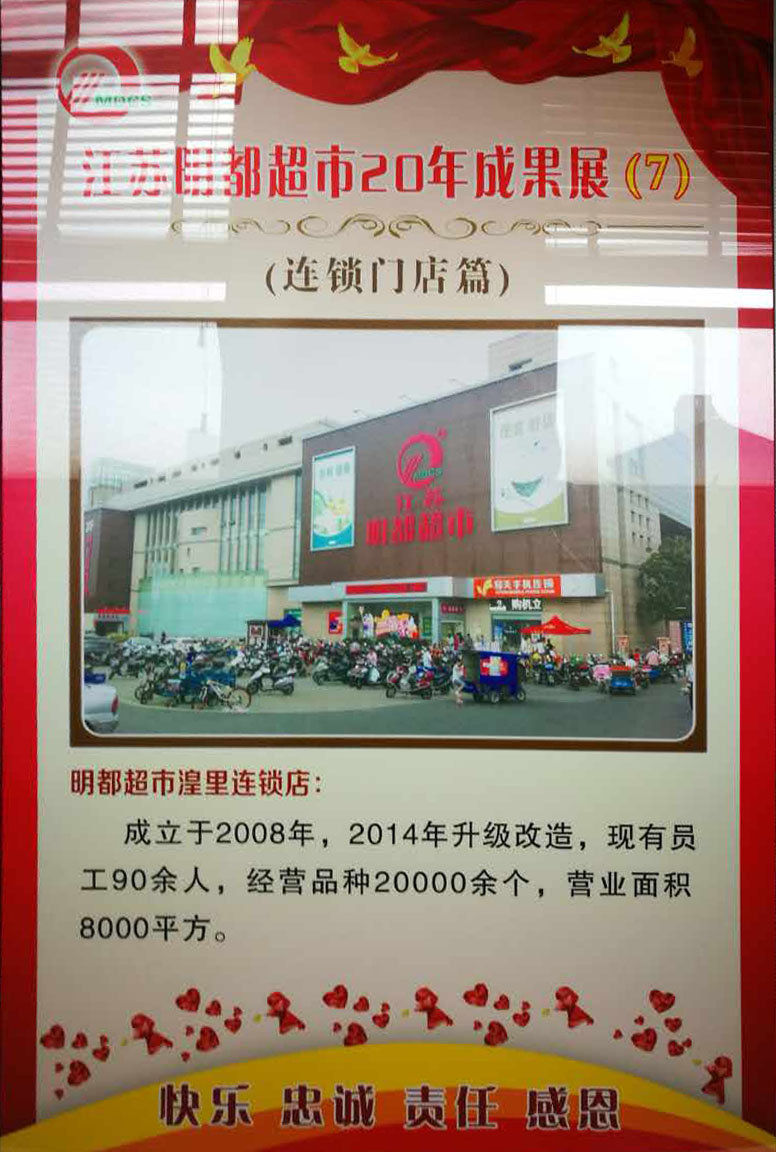 明都超市自創(chuàng)業(yè)以來(lái),始終堅(jiān)持“真誠(chéng)樹(shù)商譽(yù)”的發(fā)展理念,以提升消費(fèi)者生活品位為己任,不斷開(kāi)拓進(jìn)展。以“明都”為品牌的生活用品超市遍布常州30多個(gè)行政鄉(xiāng)鎮(zhèn)及周邊地區(qū),網(wǎng)絡(luò)覆蓋率達(dá)70%。在冊(cè)職工2000余人,營(yíng)業(yè)面積達(dá)16萬(wàn)平方米,建有5萬(wàn)平方米配送中心一個(gè)。2010年實(shí)現(xiàn)銷(xiāo)售總額6億多元,上繳稅費(fèi)為1500萬(wàn)元。為發(fā)揮骨干連鎖經(jīng)營(yíng)企業(yè)輻射帶動(dòng)作用、完善城鄉(xiāng)結(jié)合、上下貫通區(qū)、鎮(zhèn)、村三級(jí)日用消費(fèi)品現(xiàn)代經(jīng)營(yíng)網(wǎng)絡(luò)做出了應(yīng)有貢獻(xiàn)。是常武地區(qū)管理規(guī)范、形象統(tǒng)一、信譽(yù)優(yōu)良、綜合實(shí)力較強(qiáng)的連鎖超市企業(yè)。
