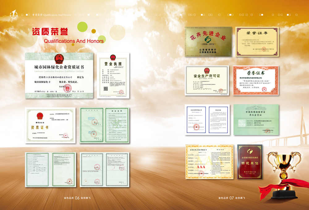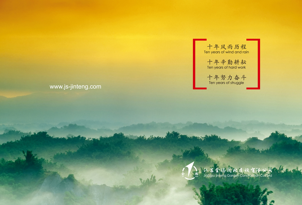 走過(guò)十年的風(fēng)雨歷程,經(jīng)過(guò)十年的辛勤耕耘,付出十年的努力奮斗,企業(yè)的規(guī)模不斷擴(kuò)大,公司堅(jiān)持以人為本,遵守“誠(chéng)信、規(guī)范、團(tuán)結(jié)、奮斗”的宗旨。公司將用優(yōu)秀的品質(zhì)服務(wù)來(lái)回報(bào)關(guān)愛(ài)公司成長(zhǎng)的社會(huì)各界人士。江蘇金騰園林建設(shè)有限公司愿攜手社會(huì)各界有識(shí)之士共創(chuàng)造美好的未來(lái)!