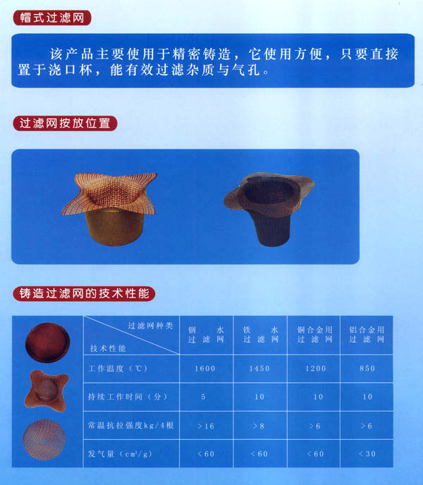 常州市猛將過濾網(wǎng)有限公司是專業(yè)生產(chǎn)系列鑄造過濾網(wǎng)的廠家。主要產(chǎn)品有:鐵水過濾網(wǎng)、鋼水過濾網(wǎng)、銅水過濾網(wǎng)、鋁水過濾網(wǎng)及熔模用帽式過濾網(wǎng)等。本廠產(chǎn)品是哈工大科研成果,榮獲國家經(jīng)委頒發(fā)的新技術(shù)成果獎(jiǎng)。航天部科技進(jìn)步一等獎(jiǎng);中國質(zhì)量檢驗(yàn)協(xié)會(huì)授予“猛將”牌高硅氧過濾網(wǎng)“國家權(quán)威檢測達(dá)標(biāo)產(chǎn)品”榮譽(yù)證書;我廠生產(chǎn)的“四角帽式過濾網(wǎng)”獲國家專利局外觀設(shè)計(jì)專利證書;并獲香港國際新技術(shù)新產(chǎn)品博覽會(huì)“金獎(jiǎng)證書”。2002年獲亞洲國際新技術(shù)新產(chǎn)品博覽會(huì)“科技發(fā)明進(jìn)步獎(jiǎng)”,2002年本廠所生產(chǎn)的“四角帽式過濾網(wǎng)在首屆“金艦杯”國際新技術(shù)成果網(wǎng)絡(luò)交易會(huì)活動(dòng)中成績顯著,被評為金杯獎(jiǎng)。同年在日內(nèi)瓦國際專利技術(shù)成果博覽會(huì)中被評為國際優(yōu)秀專利金獎(jiǎng)。目前,本廠產(chǎn)品銷往全國各省、市、自治區(qū),是國內(nèi)銷量最大的廠家之一。同時(shí)出口韓國、泰國、東南亞等國家。進(jìn)入21世紀(jì)以來,我國加入WTO后,我廠在哈工大葉榮茂教授的指導(dǎo)下,開發(fā)研制出一種多孔泡沫陶瓷過濾網(wǎng),該產(chǎn)品兼具玻璃纖維過濾網(wǎng)和直孔過濾網(wǎng)的篩分夾渣功能,且更具有吸附微小夾渣氧化物的功能。多孔泡沫陶瓷過濾網(wǎng)的主要工作原理是讓紊亂、翻騰的(TV urbuItnt Flow)金屬液經(jīng)過產(chǎn)品形成平穩(wěn)、均勻(SmoothFlow)的金屬液,金屬液經(jīng)過復(fù)雜的多孔泡沫陶瓷過濾網(wǎng),能有效地吸附截留微小氧化夾渣物,并溢除氣泡,然后能使鑄件產(chǎn)品達(dá)到純潔度高、強(qiáng)度高、韌性好、機(jī)械加工性能好等特點(diǎn),從而能夠降低生產(chǎn)成本,提高產(chǎn)品成品率,增加經(jīng)濟(jì)效益。我廠熱忱歡迎廣大用戶使用該產(chǎn)品。 我公司設(shè)計(jì)發(fā)明的“四角帽式過濾網(wǎng)”,已在2001年3月申請專利,并于當(dāng)年11月底經(jīng)中華人民共和國知識(shí)產(chǎn)權(quán)局授權(quán)公告。頒布了外觀設(shè)計(jì)專利證書,證書號(hào)第207620號(hào),F(xiàn)有個(gè)別廠家悍然侵權(quán),公然在有關(guān)鑄造媒體打出侵權(quán)產(chǎn)品廣告。對此,我們鄭重聲明,要求侵權(quán)廠家盡快采取糾正措施,為了維護(hù)我們的知識(shí)產(chǎn)權(quán),我們不排除采取法律行動(dòng)的可能。