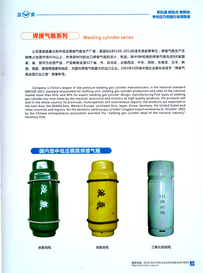 常州藍翼飛機裝備制造有限公司前身是常州飛機制造有限公司,是隸屬于中國航空工業(yè)第二集團公司專業(yè)生產(chǎn)直升機、地效飛行器的企業(yè),2007年完成整體改制,現(xiàn)已發(fā)展成以壓力容器設計和制造為主營業(yè)務的企業(yè)。公司占地70000平方米,生產(chǎn)廠房50000平方米,并擁有自行出口權,鋼質(zhì)焊接氣瓶獲國家銀質(zhì)獎, 銷量占全國的45%,是國內(nèi)較大、品種較齊的鋼質(zhì)焊接氣瓶生產(chǎn)和出口企業(yè),出口量創(chuàng)中國企業(yè)新記錄。目前公司產(chǎn)品銷往 全國和美國、德國、澳大利亞、日本、韓國、埃及、印度、東南亞、中東等國家和地區(qū)。