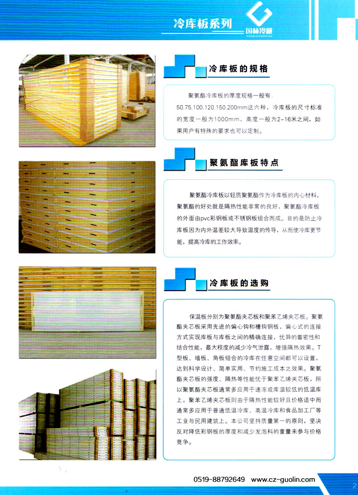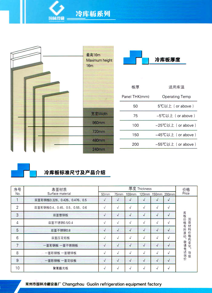 常州市國(guó)林冷藏設(shè)備廠(chǎng)(原武進(jìn)長(zhǎng)虹冷藏設(shè)備廠(chǎng))成立于1995年,地處江南水鄉(xiāng)中國(guó)富饒的“長(zhǎng)江三角洲”中心區(qū)域—江蘇常州,滬寧高速、沿江高速、312國(guó)道,交通快捷,即刻到達(dá)。 國(guó)林冷庫(kù):公司通過(guò)了ISO9001:2000質(zhì)量體系認(rèn)證,國(guó)林冷庫(kù)多次獲得“江蘇省優(yōu)質(zhì)產(chǎn)品”稱(chēng)號(hào),全國(guó)質(zhì)量服務(wù)AAAAA示范單位,并且是中國(guó)食品網(wǎng)、阿里巴巴,空調(diào)制冷誠(chéng)信通會(huì)員企業(yè),并與全國(guó)多家設(shè)計(jì)院技術(shù)合作,本廠(chǎng)的誠(chéng)信服務(wù)獲得了廣大客戶(hù)的認(rèn)可。 國(guó)林冷庫(kù):中國(guó)制冷行業(yè)的十大冷庫(kù)制造商之一,中國(guó)制冷重要工業(yè)生產(chǎn)基地。本公司***生產(chǎn)保溫庫(kù)板及冷庫(kù)制冷成套設(shè)備,庫(kù)板材料涉及不銹鋼、彩鋼板、玻璃鋼板、保溫聚氨脂板。年產(chǎn)量3000多臺(tái),庫(kù)板30多萬(wàn)平方,歡迎新好客戶(hù)前來(lái)訂購(gòu)。 國(guó)林制冷:公司始終堅(jiān)持:“質(zhì)量為上,追求品質(zhì)”的生產(chǎn)方針;始終信奉:“客戶(hù)為先,服務(wù)為本”的經(jīng)營(yíng)理念。我們?cè)竿瑥V大的新老客戶(hù)在新的世紀(jì)里,共同發(fā)展,利益雙贏(yíng),再創(chuàng)輝煌。 常州市國(guó)林冷藏設(shè)備廠(chǎng)***生產(chǎn)7.5公分,10公分,12公分,15公分,20公分的聚氨酯冷庫(kù)板,面板包括彩鋼板、不銹鋼板、壓花鋁板等各種板材,各種冷庫(kù)半埋門(mén)及平移動(dòng)門(mén),各種鐵排管和鋁排管,價(jià)格優(yōu)惠,有需要的可以聯(lián)系我金文燁18761183807