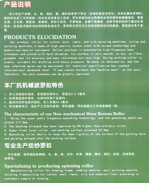 我公司于1998年成立常州進(jìn)熙羅拉廠,經(jīng)過(guò)十年多的經(jīng)營(yíng),于2011年另成立常州聽(tīng)發(fā)機(jī)械配件有限公司,現(xiàn)位于夏城路,靠近湖塘紡織城。 本公司產(chǎn)值從公司成立起從2010年350萬(wàn)逐步提交至2011年的500萬(wàn),2012年有望達(dá)到1000萬(wàn)。主要客戶(hù),河南中原油田,湯姆機(jī)械,上海中行汽保,上海第一紡機(jī)廠,岡熱機(jī)械(常州)。 產(chǎn)品科類(lèi):紡機(jī)配件,抽油桿防磨扶正器,各種精密機(jī)械加工。 技術(shù)能力:本公司有6136數(shù)控7臺(tái),6146數(shù)控1臺(tái),6150數(shù)控1臺(tái),進(jìn)口斜床身1臺(tái),立式加工中心4臺(tái),有專(zhuān)職校車(chē)師傅2名,質(zhì)量巡檢,檢驗(yàn)員各1名。 為了擴(kuò)大生產(chǎn)能力,本公司可能于近年內(nèi)搬遷至更大廠區(qū),尋求更大更高的發(fā)展空間。