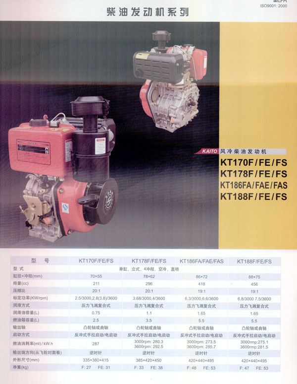 常州常柴集團(tuán)凱拓電動(dòng)機(jī)械有限公司是常柴集團(tuán)所屬,集自主研發(fā)設(shè)計(jì)及生產(chǎn)的出口型產(chǎn)業(yè)基地。 常柴集團(tuán)是一家擁有近一萬名在職員工的國有大型企業(yè),年均產(chǎn)值近三億美元,平均出口總額近八千萬美元,同時(shí)也是中國內(nèi)地五百強(qiáng)企業(yè)之一! 〕2窦瘓F(tuán)凱拓電動(dòng)機(jī)械有限公司的主要產(chǎn)品流水線基于日本YAMMAR型超級(jí)風(fēng)冷柴油發(fā)動(dòng)機(jī),以及其配套發(fā)電機(jī)組,水泵機(jī)組和數(shù)碼變頻發(fā)電機(jī),我司目前擁有常柴集團(tuán)及凱拓品牌的知名商標(biāo)使用權(quán),旗下所有分廠如機(jī)械加工廠、鑄造廠以及發(fā)動(dòng)機(jī)廠等生產(chǎn)基地都通過了ISO9001-2000質(zhì)量管理體系認(rèn)證。我司自主品牌凱拓柴油發(fā)電機(jī)組KT5000SE,KT5000LE,數(shù)碼變頻發(fā)電機(jī)KT1000Ti以及柴油發(fā)動(dòng)機(jī)186F均通過德國TUV公司的CE認(rèn)證,美洲EPA認(rèn)證,因此出口量很大,近年來公司產(chǎn)品已遠(yuǎn)銷美洲、歐洲、非洲以及東南亞國家和地區(qū)! ∫劳谐2窦瘓F(tuán)的領(lǐng)先技術(shù),強(qiáng)有力的管理體制,以及健全的產(chǎn)品質(zhì)量體系,我司通過不斷優(yōu)化自主設(shè)計(jì)研發(fā),完善管理機(jī)制,期望能夠以提供最優(yōu)質(zhì)的產(chǎn)品售后服務(wù)進(jìn)一步拓展國際市場(chǎng)! ”局皥F(tuán)結(jié)、合作、奮斗”的公司理念,我們希望著眼全球,與更多潛在的客戶開展合作交流,最終實(shí)現(xiàn)雙贏的戰(zhàn)略目標(biāo)。