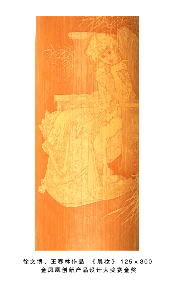 得獎(jiǎng)情況 1、扇形擺件《花鳥(niǎo)》2004年9月太湖博覽會(huì)金獎(jiǎng) 2、《蘭亭序》2008年11月江蘇藝博杯工藝美術(shù)精品獎(jiǎng)銀獎(jiǎng) 3、《雄風(fēng)圖》2008年11月江蘇藝博杯工藝美術(shù)精品獎(jiǎng)創(chuàng)意獎(jiǎng) 4、《靜音》2008年11月“天工藝苑•百花杯”中國(guó)工藝美術(shù)精品獎(jiǎng)銀獎(jiǎng) 5、《人物》2008年12月中國(guó)收藏藝術(shù)精品博覽會(huì)金獎(jiǎng) 6、《花鳥(niǎo)》200 8年12月中國(guó)收藏藝術(shù)精品博覽會(huì)銀獎(jiǎng) 7、《青竹鳥(niǎo)語(yǔ)》2008年12月中國(guó)收藏藝術(shù)品博覽會(huì)“入圍收藏品” 8、《吉祥富貴》2009年3月“金鳳凰”創(chuàng)新產(chǎn)品設(shè)計(jì)大獎(jiǎng)賽金獎(jiǎng) 9、《黃山云海》2009年10月江蘇藝博杯工藝美術(shù)精品獎(jiǎng)金獎(jiǎng) 10、《花鳥(niǎo)》2009年10月第二屆江蘇旅游商品博覽會(huì)最佳產(chǎn)品獎(jiǎng) 11、《秋菊?qǐng)D》2009年11月“天工藝苑•百花杯”中國(guó)工藝美術(shù)精品獎(jiǎng)銀獎(jiǎng) 12、《秋鷹圖》2010年3月“金鳳凰”創(chuàng)新產(chǎn)品設(shè)計(jì)大獎(jiǎng)賽優(yōu)秀獎(jiǎng) 13、《花鳥(niǎo)四屏》2010年3月“金鳳凰”創(chuàng)新產(chǎn)品設(shè)計(jì)大獎(jiǎng)賽銅獎(jiǎng) 14、《荷塘清暑》2010年5月深圳國(guó)際文化產(chǎn)業(yè)博覽交易會(huì)銅獎(jiǎng) 15、《溪山煙云圖》2010年9月江蘇藝博杯工藝美術(shù)精品大獎(jiǎng)賽金獎(jiǎng) 16、《高士臨風(fēng)圖》2010年10月“天工藝苑•百花杯”中國(guó)工藝美術(shù)精品獎(jiǎng)銀獎(jiǎng) 17、《溪山煙云圖》2010年11月第二屆東方工藝美術(shù)之都博覽會(huì)“迎春花獎(jiǎng)” 18、《深山尋隱圖》2011年3月“金鳳凰”產(chǎn)品設(shè)計(jì)大獎(jiǎng)賽銅獎(jiǎng) 19、《欣欣向榮》2011年5月深圳國(guó)際文化產(chǎn)業(yè)博覽交易會(huì)金獎(jiǎng) 20、《江崖遠(yuǎn)眺圖》2011年9月江蘇藝博杯工藝美術(shù)精品大獎(jiǎng)賽金獎(jiǎng) 21、《富春山居圖》2011年10月“天工藝苑•百花杯”中國(guó)工藝美術(shù)精品獎(jiǎng)金獎(jiǎng) 22、《深山訪友》2011年11月中國(guó)無(wú)錫國(guó)際文化藝術(shù)博覽會(huì)銀獎(jiǎng) 23、《幽谷清音》2012年3月“金鳳凰”創(chuàng)新產(chǎn)品設(shè)計(jì)大獎(jiǎng)賽銅獎(jiǎng) 24、《群芳競(jìng)艷》2012年10月“儒仕儒家、百花杯”中國(guó)工藝美術(shù)精品博覽會(huì)金獎(jiǎng) 25、《山村渡口圖》2012年12江蘇藝博杯工藝美術(shù)精品大獎(jiǎng)賽金獎(jiǎng)。 26、《晨妝》2013年4月“金鳳凰”創(chuàng)新產(chǎn)品設(shè)計(jì)大獎(jiǎng)賽金獎(jiǎng)。 27、《和風(fēng)圖》2013年6月中國(guó)(青島)工藝美術(shù)博覽會(huì)創(chuàng)新產(chǎn)品設(shè)計(jì)大賽金獎(jiǎng)。 28、《松壑聽(tīng)泉》2013年9月江蘇藝博杯工藝美術(shù)精品大獎(jiǎng)賽銀獎(jiǎng)。 29、《君子圖》2013年11月“國(guó)信•百花杯”中國(guó)工藝美術(shù)精品獎(jiǎng)銀獎(jiǎng) 30《碧水輕舟》2014年5月深圳國(guó)際文化產(chǎn)業(yè)博覽交易會(huì)銀獎(jiǎng)。 31、《千巖萬(wàn)壑圖》2014年10月“中國(guó)原創(chuàng)•百花杯”中國(guó)工藝美術(shù)精品獎(jiǎng)金獎(jiǎng) 32、《溪山訪友圖》2014年10月江蘇藝博杯工藝美術(shù)精品大獎(jiǎng)賽銀獎(jiǎng) 33、《深山云壑》2014年12月深圳冬季國(guó)際文化產(chǎn)業(yè)博覽交易會(huì)金獎(jiǎng) 34、《鷹》2015年深圳文化產(chǎn)業(yè)博覽交易會(huì)獲“中國(guó)工藝美術(shù)文化創(chuàng)意獎(jiǎng)”金獎(jiǎng)