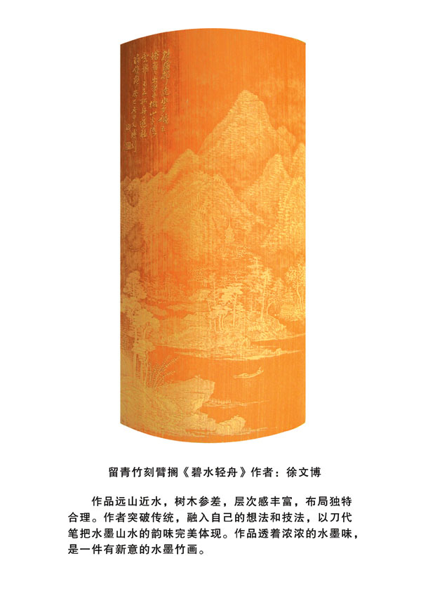 徐博(藝名文博),1973年生,江蘇武進(jìn)人,江蘇省省名人,高級(jí)工藝美術(shù)師,常州市留青竹刻非遺傳承人,常州工藝美術(shù)家協(xié)會(huì)理事,被譽(yù)為當(dāng)今中國(guó)最具創(chuàng)新意識(shí)的新銳竹刻家代表,多次獲得國(guó)家工藝美術(shù)大獎(jiǎng)?釔(ài)留青竹刻的徐文博賞竹為樂(lè),以竹詠志,借竹抒懷,悉心探索留青竹刻的藝術(shù)表現(xiàn)。在中國(guó)工藝美術(shù)大師蕭劍波的精心指導(dǎo)下,開(kāi)創(chuàng)留青水墨山水之技法,更好的體現(xiàn)了竹刻淡雅清秀的藝術(shù)風(fēng)格,并不斷汲取書(shū)畫(huà)、攝影、雕塑等藝術(shù)精華,不斷滋養(yǎng)藝術(shù)情趣,提升擴(kuò)展胸襟人格的同時(shí)也逐步形成了其形神兼?zhèn)洌搶?shí)相生,氣韻生動(dòng)的藝術(shù)特點(diǎn),作品為眾多的國(guó)內(nèi)外收藏家珍藏。