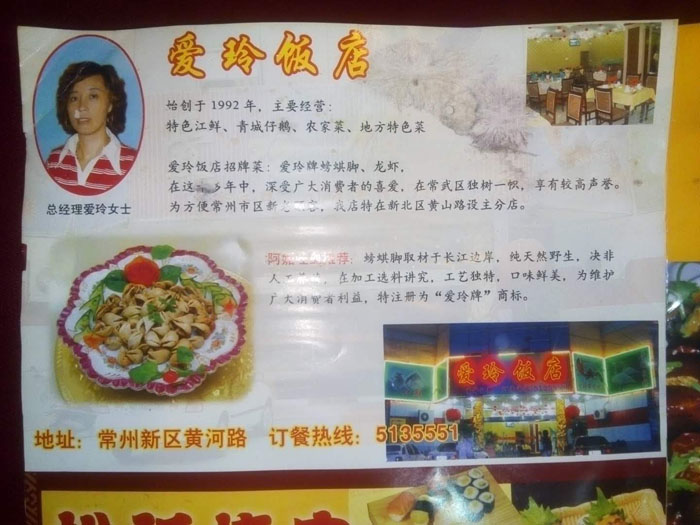 常州新北區(qū)魏村愛玲小吃部始創(chuàng)于1992年,主要經(jīng)營:特色江鮮、青城仔鵝、農家菜、地方特色菜。 愛玲飯店招牌菜:愛玲牌螃蜞腳、龍蝦,在這十多年中,深受廣大消費者的喜愛,在常武區(qū)獨樹一幟,享有較高聲譽。為方便常州市區(qū)新老客戶,我店在新北區(qū)黃山路設主分店。