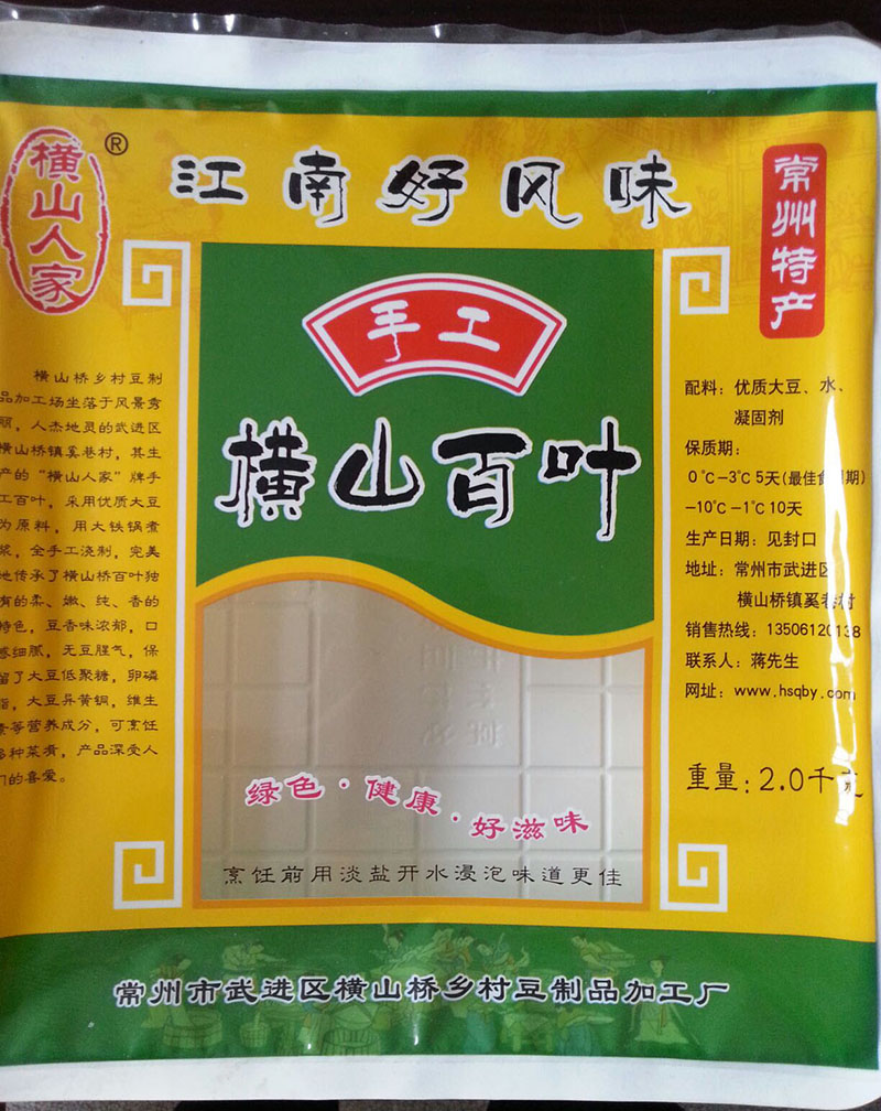 橫山橋鄉(xiāng)村豆制品加工場(chǎng)坐落于風(fēng)景秀麗,人杰地靈的武進(jìn)區(qū)橫山橋鎮(zhèn)奚巷村,其生產(chǎn)的“橫山人家”牌手工百葉,采用優(yōu)質(zhì)大豆為原料,用大鐵鍋煮漿,全手工澆制,完美地傳承了橫山橋百葉獨(dú)有的柔、嫩、純、香的特色,豆香味濃郁,口感細(xì)膩,無(wú)豆腥氣,保留了大豆低聚糖,卵磷脂,大豆異黃銅,維生素等營(yíng)養(yǎng)成分,可烹飪多種菜肴。產(chǎn)品主要銷往上海、南京以及常武地區(qū)的各大飯店,深受人們的喜愛(ài)。 多年來(lái),我們積極倡導(dǎo)“誠(chéng)信如同生命,口碑重于泰山”的經(jīng)營(yíng)理念,高度重視產(chǎn)品質(zhì)量和衛(wèi)生,力爭(zhēng)讓“橫山人家”品牌豆制品成為消費(fèi)者最安全!最貼心!最認(rèn)可的橫山橋百葉品牌。
