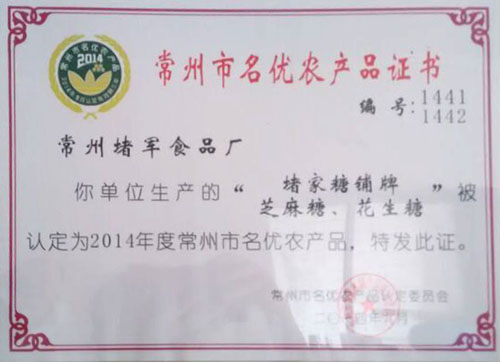 “堵家糖鋪”牌芝麻糖。2013年度生產(chǎn)量已達(dá)100噸左右實現(xiàn)銷量額為250萬元,同時本廠的產(chǎn)品已進入“瑞和泰"“好比家”“名仁”常州機場等高端銷售區(qū)域,并與“瑞和泰”形成戰(zhàn)略合作伙伴關(guān)系:為瑞和泰貼牌加工生產(chǎn)。 常州堵軍食品廠生產(chǎn)的芝麻糖是以:大米和麥芽用相傳百年歷史的循環(huán)水濾蒸煮法提煉出其中的麥芽糖漿,再用芝麻,花生,桂花,橘皮,面粉為輔料,歷23道工序手工制作而成。它是一種具有營養(yǎng)豐富性和抗衰老性食品。富含蛋白質(zhì),脂肪,維生素A,維生素B,鈣鐵鎂,卵磷脂,硫胺素等營養(yǎng)元素。 全麥芽芝麻糖是一種獨具地方特色的大眾性休閑食品。有其獨特的地方性和文化性。無論是逢年過節(jié)還是日常生活都是饋贈親友,款待賓客的首選佳品之一。