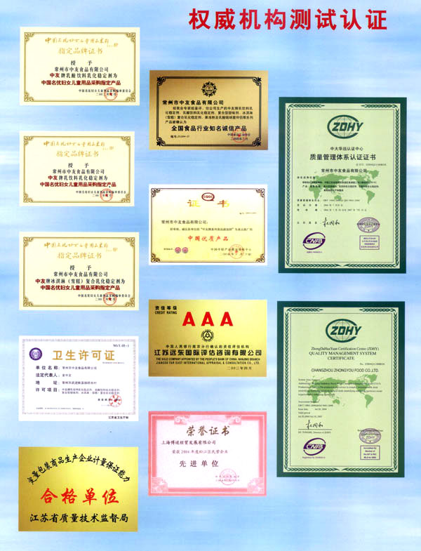 常州市中友食品有限公司;匚挥诔V菔袞|郊開發(fā)區(qū),廠房占地面積6000平方米,擁有全新的生產(chǎn)線,先進(jìn)的生產(chǎn)流程和嚴(yán)格的質(zhì)量管理體系(工廠已通過IS09001:2000質(zhì)量管理體系的認(rèn)證)。并有專業(yè)的技術(shù)開發(fā)和理化檢驗(yàn)的設(shè)施、經(jīng)驗(yàn)豐富的技術(shù)人員。公司以科技為依托,常年與高等院校合作,不斷地開發(fā)和研制適合市場需求的食品添加劑系列產(chǎn)品。公司每年面向全國招收優(yōu)秀的博士、碩士及優(yōu)秀的大學(xué)生。公司現(xiàn)有員工1 00多人,管理人員2 0名、高工5名、產(chǎn)品專業(yè)技術(shù)開發(fā)人員12名,還有選擇地引進(jìn)和代理國內(nèi)外各種適用的食品添加劑。 依靠本公司雄厚的科技力量和先進(jìn)的科技設(shè)備,生產(chǎn)基地已經(jīng)具備了與客戶共同開發(fā)國內(nèi)外先進(jìn)食品添加劑的應(yīng)用技術(shù)。博適中友公司多年來致力于食品添加劑的研究和開發(fā),突破常規(guī)理念,以市場、用戶為中心,研究開發(fā)各個(gè)品種、各個(gè)檔次的食品添加劑,品種齊全又多樣,既有出口型又有內(nèi)銷型。公司主要穩(wěn)定劑產(chǎn)品有:乳飲料乳化穩(wěn)定劑、乳酸飲料乳化穩(wěn)定劑、冰淇淋(雪糕)復(fù)合乳化穩(wěn)定劑、果汁飲料乳化穩(wěn)定劑等,產(chǎn)品暢銷國內(nèi)外,覆蓋了全國二十多個(gè)省市,并建立了穩(wěn)定的銷售網(wǎng)絡(luò)。 本公司對(duì)產(chǎn)品指定了嚴(yán)格的質(zhì)量標(biāo)準(zhǔn),并報(bào)請(qǐng)常州市技術(shù)檢驗(yàn)監(jiān)督局審核批準(zhǔn),其技術(shù)要求完全符合GB一2760(食品添加劑使用衛(wèi)生標(biāo)準(zhǔn))和符合聯(lián)合國直接衛(wèi)生組織(WHO)、聯(lián)合國食品與農(nóng)業(yè)組織(FAO)以及美國食品和藥物管理局的有關(guān)規(guī)定。 長期以來,博適中友公司以市場定位為基本依據(jù),堅(jiān)持發(fā)展并開辟多元化的國內(nèi)外市場:以專業(yè)化、長遠(yuǎn)化、規(guī);癁榻(jīng)營思路:以開拓創(chuàng)新,務(wù)實(shí)誠信為經(jīng)營理念,不斷促進(jìn)企業(yè)發(fā)展壯大。 公司自創(chuàng)建以來,始終不渝地堅(jiān)持質(zhì)量第一、信譽(yù)至上,以精湛的工藝加工產(chǎn)品,不管是標(biāo)準(zhǔn)的或特制的都可享有本公司優(yōu)良的技術(shù)服務(wù)。無論您需要何種功能性添加劑,博適中友食品添加劑公司均能滿足您的要求。博適中友公司以價(jià)格合理、服務(wù)周到為經(jīng)營宗旨,努力引導(dǎo)食品添加劑應(yīng)用發(fā)展的新潮流、新方向。在才能卓越的領(lǐng)導(dǎo)者的帶領(lǐng)下,全體員工以開拓、創(chuàng)新、求實(shí)、守信為企業(yè)精神,不斷地提高自身的素質(zhì)。 公司的宗旨是“開拓創(chuàng)新發(fā)展、精誠服務(wù)和諧”為目標(biāo),熱忱與各界有識(shí)之士攜手共進(jìn),共創(chuàng)輝煌!如今公司業(yè)務(wù)蒸蒸日上,專業(yè)技術(shù)研究越走越精,這都與廣大客戶大力支持分不開。在新世紀(jì)來臨之際,上海博適中友公司愿與您真誠合作,攜手并進(jìn),共鑄新的輝煌!