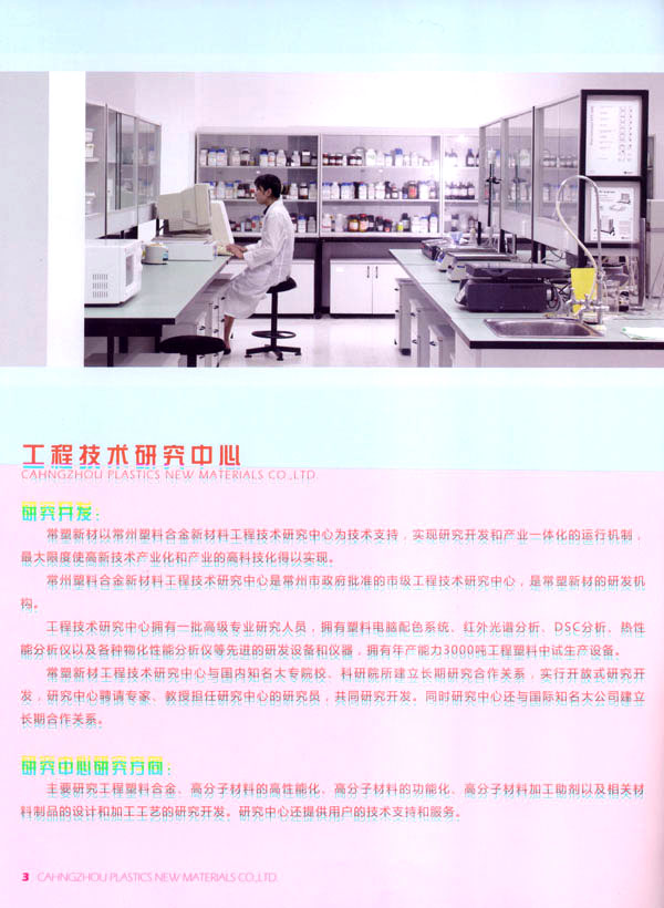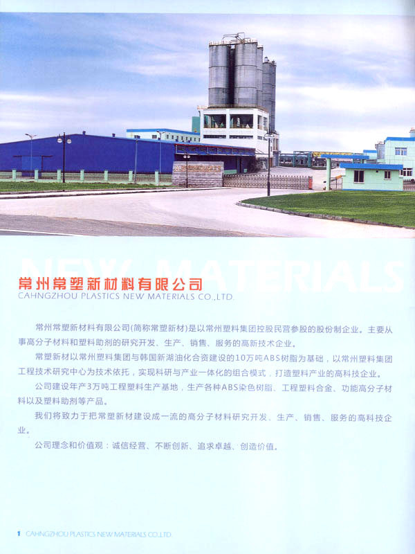 常州常塑新材料有限公司(原名常州塑料集團(tuán)新材料有限公司)是一家民營(yíng)股份制企業(yè)。主要從事高分子材料和塑料助劑的研究開發(fā)、生產(chǎn)、銷售、服務(wù)。 常塑新材料以常州塑料集團(tuán)與韓國(guó)新湖油化合資建設(shè)的10萬(wàn)噸ABS樹脂為基礎(chǔ),和與德國(guó)吉瑪公司合資建設(shè)的20萬(wàn)噸PET樹脂。以常州塑料集團(tuán)工程技術(shù)研究中心為技術(shù)依托,實(shí)現(xiàn)科研與產(chǎn)業(yè)一體化的組合模式。 公司建設(shè)年產(chǎn)3萬(wàn)噸工程塑料生產(chǎn)基地,生產(chǎn)各種阻燃ABS、耐熱ABS樹脂、工程塑料合金、功能高分子材料以及塑料助劑等產(chǎn)品。 公司目標(biāo):把常塑新材料建設(shè)成一流的高分子材料研究開發(fā)、生產(chǎn)、銷售、服務(wù)的高科技企業(yè)。 公司理念和價(jià)值觀:誠(chéng)信經(jīng)營(yíng)、不斷創(chuàng)新、追求卓越、創(chuàng)造價(jià)值。 公司旨在創(chuàng)造以人為本不斷創(chuàng)新的企業(yè)可持續(xù)發(fā)展的核心競(jìng)爭(zhēng)力,為社會(huì)創(chuàng)造價(jià)值。