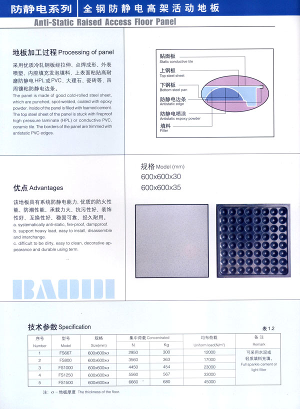 常州市寶進(jìn)防靜電設(shè)備有限公司是各類防靜電產(chǎn)品開發(fā)、設(shè)計(jì)、制造、安裝服務(wù)于一體的企業(yè)。以上海物理學(xué)會(huì)空間靜電專業(yè)委員會(huì)強(qiáng)大的技術(shù)力量為后盾。公司主要致力于各類機(jī)房、電氣室設(shè)計(jì)、安裝;各類防靜電干擾處理及用戶特種需求。公司擁有防空間靜電干擾—聲學(xué)復(fù)合系統(tǒng)、輕質(zhì)全鋼活動(dòng)地板、高環(huán)保型抗靜電貼面等多項(xiàng)發(fā)明專利,是國(guó)內(nèi)該行業(yè)中唯一擁有自主知識(shí)產(chǎn)權(quán)的企業(yè)。 公司主要產(chǎn)品“寶迪”牌 防靜電高架地板及板材、OA網(wǎng)絡(luò)地板。產(chǎn)品廣泛用于電子廠房、金融系統(tǒng)、電力、廣電、軍隊(duì)及智能化樓宇。并向多個(gè)國(guó)家出口。 針對(duì)發(fā)泡水泥填充的全鋼高架地板自身重、承載差的缺點(diǎn),我們開發(fā)了輕質(zhì)全鋼高架地板。在提前地板承載的同時(shí),大幅減輕了地板的自重。 公司一貫嚴(yán)格執(zhí)行ISO9001-2000質(zhì)量保證體系,為用戶提供高品質(zhì)的產(chǎn)品及完善的售后服務(wù)是公司一貫的宗旨。