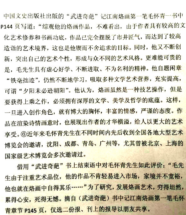 近年來(lái),創(chuàng)作的烙畫(huà)作品分別獲得過(guò)全國(guó)、省市級(jí)的金、銀、銅獎(jiǎng)多次。中央電視臺(tái)曾兩次播放過(guò)本人的烙畫(huà)作品,江蘇電視臺(tái)、常州電視臺(tái)也曾多次播放過(guò)本人的作品與烙畫(huà)藝術(shù)生涯,揚(yáng)子晚報(bào)、常州日?qǐng)?bào)、常州晚報(bào)也曾多次報(bào)導(dǎo)過(guò)本人的烙畫(huà)作品,出版物有三種版本都能查閱到介紹本的烙畫(huà)從藝生涯與藝術(shù)業(yè)績(jī)。
