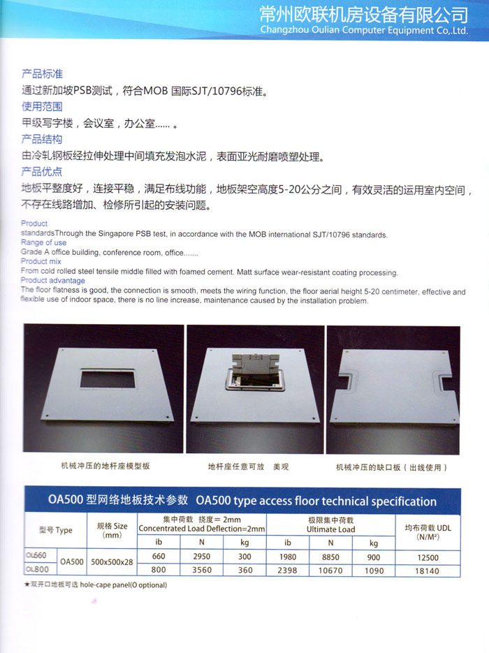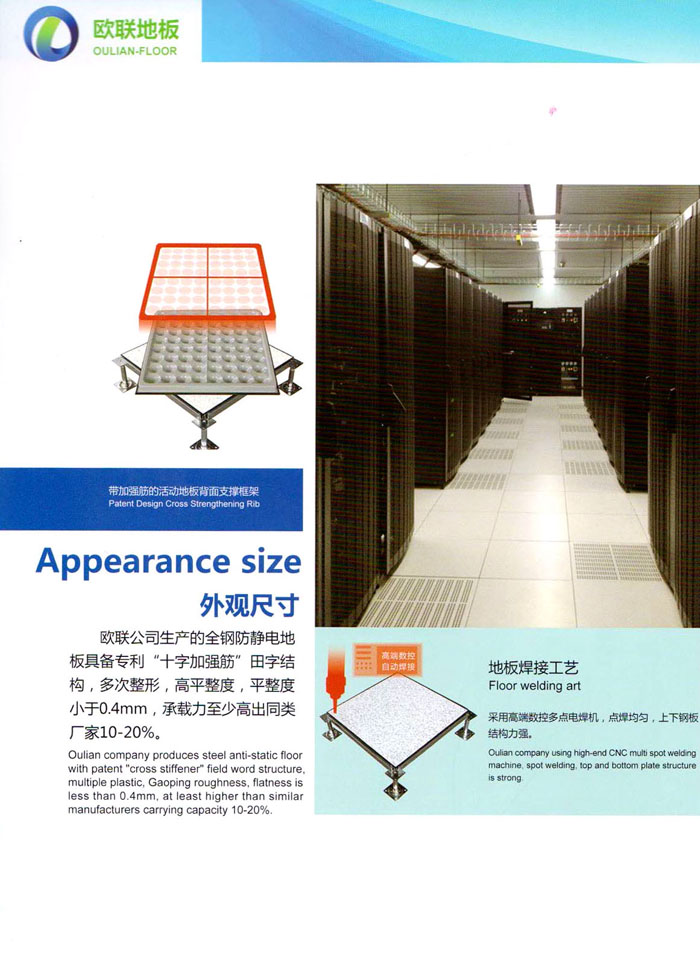 防靜電高架活動地板、全鋼地板、陶瓷地板是計算機行業(yè)發(fā)展起來的新型鋪地材料,隔離了潮氣、靜電灰塵,最重要的是解決了綜合布線問題,無需預(yù)埋管線,可隨時拆卸、搬移,保證了資訊設(shè)備完整的優(yōu)點,適應(yīng)了智能化樓宇中信息自動化技術(shù)對所處環(huán)境的特定要求,避免了廣大客戶的雙重投資,使現(xiàn)代化辦公程度更加高效,辦公場所更加舒適。 “歐聯(lián)”系列全鋼地板,符合國家安全要求,種類完備多樣,其中防靜電陶瓷地板、硫酸鈣地板等除具有普通瓷質(zhì)的裝飾和實用性外,其耐磨、防水、防火功能優(yōu)于其它同類產(chǎn)品,防靜電系列地板,能切合不同客戶的要求,其靈活的配置,深受客戶歡迎,不同材質(zhì)的地板結(jié)構(gòu)使設(shè)計師的設(shè)計空間比傳統(tǒng)的更加廣闊自由和善變。 公司大力發(fā)展國內(nèi)外銷售業(yè)務(wù),多次中標國內(nèi)重點工程 ,例:哈爾濱醫(yī)科大學(xué)、山東大學(xué)、上海普通機場等。 公司將一如既往開發(fā)和制造一流的產(chǎn)品,愿與廣大有識之士合作發(fā)展,共創(chuàng)美好未來。