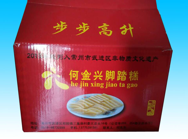 常州鄭陸何金興腳踏糕制作坊從事腳踏糕制作工藝200多年,五代傳承,制作面積300平方米左右,腳踏糕是用黏性大的米或米粉蒸成的糕,是中國農(nóng)歷年的應(yīng)時食品。春節(jié),我國很多地區(qū)都有講究吃年糕。年糕有紅、黃、白三色,象征金銀,年糕又稱“年年糕”,與“年年高”諧音,寓意著人們的工作和生活一年比一年提高。所以前人有詩稱年糕:“年糕寓意稍云深,白色如銀黃色如金。年歲盼高時時利,虔誠默祝望財臨。”另有浙江省寧波市江北區(qū)慈城鎮(zhèn)的水磨年糕也是特別有名。