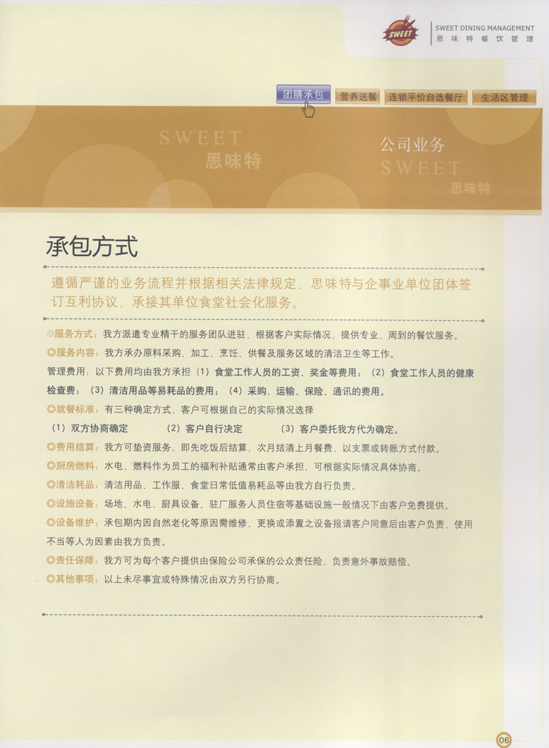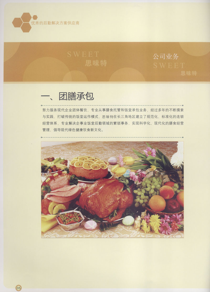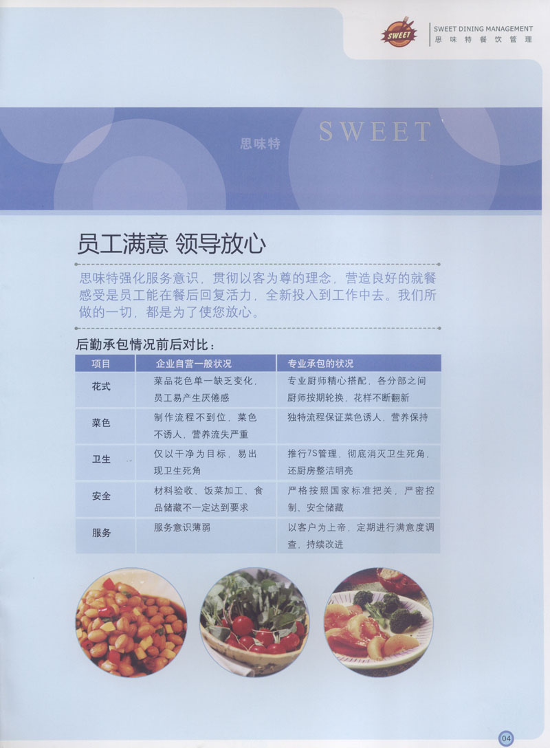 常州市思味特餐飲有限公司是一家專業(yè)從事企事業(yè)后勤服務(wù)的有限責(zé)任公司,公司從承包食堂起步,逐漸發(fā)展為經(jīng)營團膳承包、營養(yǎng)送餐、生活區(qū)管理、連鎖餐廳的綜合型企業(yè)。2008年公司斥資100萬元,在常州興建了可以同時提供3000餐膳食的中央廚房,重點打造“和美客”后勤服務(wù)品牌,全力為企事業(yè)單位解決后勤后顧之憂。 到目前為止,我們合作成功的企事業(yè)單位超過50多家,服務(wù)人數(shù)突破15萬,合作單位包括國家機關(guān)、國有企業(yè)、三資企業(yè)、民營企業(yè)、學(xué)校、醫(yī)院等,其中不乏國際知名品牌公司。 和美客愿為更多的國內(nèi)外企事業(yè)單位及機關(guān)團體分憂解難,從廚房設(shè)計、菜品配送、團膳承包、到生活區(qū)管理等提供全方位的服務(wù)。