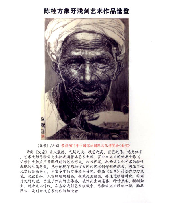 陳桂方,江蘇常州武進(jìn)人,中國著名雕刻藝術(shù)家,江蘇省工藝美術(shù)大師、研究員級(jí)、高級(jí)工藝美術(shù)師,江蘇省非物質(zhì)文化遺產(chǎn)《象牙淺刻》代表性傳承人。畢業(yè)于中國書畫函授大學(xué),深造于清華大學(xué)、南大美術(shù)系,現(xiàn)任中國工藝美術(shù)協(xié)會(huì)會(huì)員,江蘇省工藝美術(shù)學(xué)會(huì)理事,常州市工藝美術(shù)家協(xié)會(huì)副秘書長,常州市工藝美術(shù)行業(yè)協(xié)會(huì)常務(wù)理事,武進(jìn)工藝美術(shù)協(xié)會(huì)副主席。陳桂方大師淺刻作品的藝術(shù)特點(diǎn):山水氣韻生動(dòng),氣勢磅礴,場面壯觀,刀法細(xì)膩:人物仕女生動(dòng)可人,栩栩如生,充分表達(dá)體現(xiàn)了中國象牙工藝獨(dú)具的內(nèi)在文化底蘊(yùn)和現(xiàn)代社會(huì)的審美觀念及獨(dú)特的淺刻藝術(shù)表現(xiàn)技藝。對每件藝術(shù)作品創(chuàng)作都精益求精,強(qiáng)調(diào)藝術(shù)創(chuàng)作的思想性、意境及內(nèi)涵。注重章法構(gòu)思,掌握牙刻藝術(shù)的特性表現(xiàn),作品具有鮮明生動(dòng)的時(shí)代氣息,獨(dú)具所創(chuàng)工筆與寫意相結(jié)合的牙刻藝術(shù)表現(xiàn)手法和表現(xiàn)形式,出眾、飄逸、多變的刀法技藝,粗獷處見細(xì)微、方寸間見大觀的創(chuàng)作理念深受專家權(quán)威的肯定和業(yè)內(nèi)人士的一致好評。陳桂方大師至企頑事象牙淺刻藝術(shù)創(chuàng)作近四十余載,完善了自己的創(chuàng)作體系,成就了自己獨(dú)特的藝術(shù)風(fēng)格。作品數(shù)年來連續(xù)二十多次榮獲國家最高藝術(shù)精品大獎(jiǎng)《金獎(jiǎng)》,象牙淺刻作品《李逵探母》已被國家工藝美術(shù)館收藏,并頒發(fā)了國家收藏證書,在全國數(shù)十年間尚屬首次。當(dāng)前,陳桂方牙刻藝術(shù)作品已深受廣大海內(nèi)外業(yè)內(nèi)人士、收藏家們的鐘愛、青睞、熱藏,并被譽(yù)為當(dāng)代最杰出最具潛質(zhì)的實(shí)力派藝術(shù)大師。