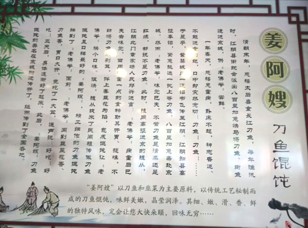武進(jìn)高新區(qū)姜阿嫂刀魚餛飩店經(jīng)營面積480平方米,可容納150人左右用餐,主要特色刀魚餛飩,蟹黃大湯包,榮獲“江蘇省鄉(xiāng)村美食節(jié)”金獎和銀獎。另外還有特色刀魚面,刀魚春卷及蟹肉餛飩,蝦肉餛飩。 本店在經(jīng)營過程中堅持以品質(zhì)為主,貨真價廉,貨品貴面價不貴,原料“刀魚”全是現(xiàn)場開片去骨。開業(yè)至今,深受廣大消費者的好評,是常州地區(qū)唯一以刀魚為特色的餐飲店。