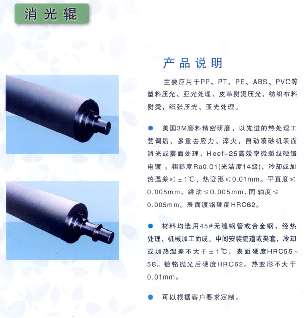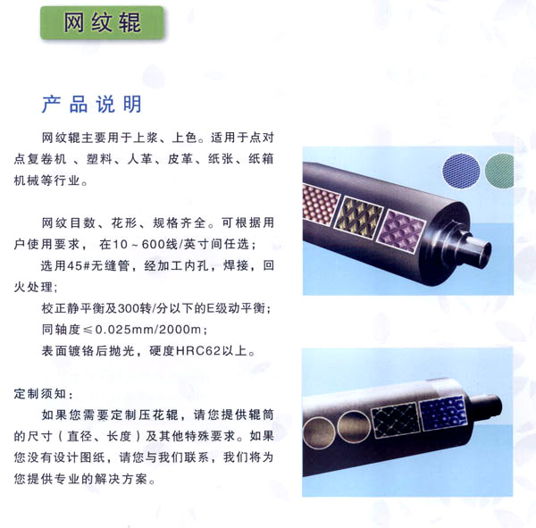常州市武進(jìn)區(qū)禮嘉鎮(zhèn)萬(wàn)超機(jī)械有限公司專(zhuān)業(yè)生產(chǎn)、加工花輥、鏡面輥、無(wú)紡布設(shè)備,及各類(lèi)機(jī)械配件。產(chǎn)品廣泛應(yīng)用于金屬、塑料、皮革、紙張、玻璃、木材、無(wú)紡布、衛(wèi)生材料、包裝裝潢等行業(yè)。 公司經(jīng)營(yíng)方針:服務(wù)鍥而不舍 品質(zhì)力臻卓越。得到國(guó)內(nèi)眾多客戶的厚愛(ài)與好評(píng)。 歡迎各界朋友蒞臨常州萬(wàn)超機(jī)械有限公司指導(dǎo)和業(yè)務(wù)洽談。 萬(wàn)超為顧客免費(fèi)打樣、并代客壓紋!