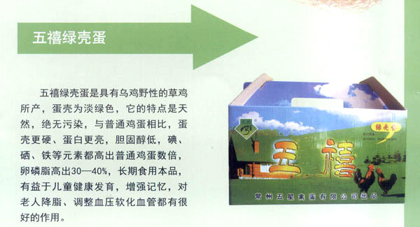 常州五星禽蛋有限公司創(chuàng)建于1990年,是常州市最大的禽蛋生產(chǎn)基地。公司秉承“辦實事、服務(wù)城市;上水平,掙創(chuàng)效益”的經(jīng)營宗旨。注重科技開發(fā)與管理創(chuàng)新,全力打造“五禧”品牌。公司于2000年通過了ISO9002質(zhì)量體系認證;2004年又通過了無公害雞蛋產(chǎn)地和產(chǎn)品認證,并獲兩項專利。 經(jīng)多年努力實現(xiàn)了“五禧”產(chǎn)品系列化。現(xiàn)公司每年向市場提供有“五禧”鮮雞蛋,“五禧”土雞蛋,“五禧”ELC蛋,“五禧”綠殼草雞蛋,成為了不同消費群體的理想選擇!拔屐钡岸啻螛s獲常州市場知名商標稱號。