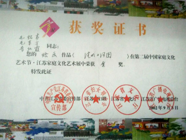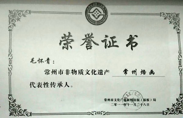 毛懷青,江蘇常州市武進(jìn)人。 中國(guó)工藝美術(shù)學(xué)會(huì)會(huì)員,常州市中國(guó)烙畫研究會(huì)副會(huì)長(zhǎng),常州市文博鑒賞協(xié)會(huì)理事,非物質(zhì)文化遺產(chǎn)烙畫傳承人。高級(jí)工藝美術(shù)師。 年輕時(shí)學(xué)習(xí)國(guó)畫、油畫中年蔓現(xiàn)掌州咯畫源遠(yuǎn)流長(zhǎng)、歷史悠久,有著其它美術(shù)門類不具備的藝術(shù)風(fēng)格與特色。可謂是工藝美術(shù)中的一朵十分亮麗的藝術(shù)奇葩,是我民族先人給我們留下的一份不可多得十分珍貴的一份文化遺產(chǎn)。為弘揚(yáng)與發(fā)展這份優(yōu)秀文化遺產(chǎn),我從此下定決心研究烙畫,愿付出一份力量為振興烙畫事業(yè)做出貢獻(xiàn)。至今已潛心研究幾十年,取得了可喜的成績(jī),被業(yè)界公認(rèn),社會(huì)關(guān)注與認(rèn)可。有“江南烙畫第一筆”之美譽(yù)。 近年來(lái),創(chuàng)作的烙畫作品分別獲得過(guò)全國(guó)、省市級(jí)的金、銀、銅獎(jiǎng)多次。中央電視臺(tái)曾兩次播放過(guò)本人的烙畫作品,江蘇電視臺(tái)、常州電視臺(tái)也曾多次播放過(guò)本人的作品與烙畫藝術(shù)生涯,揚(yáng)子晚報(bào)、常州日?qǐng)?bào)、常州晚報(bào)也曾多次報(bào)導(dǎo)過(guò)本人的烙畫作品,出版物有三種版本都能查閱到介紹本的烙畫從藝生涯與藝術(shù)業(yè)績(jī)。