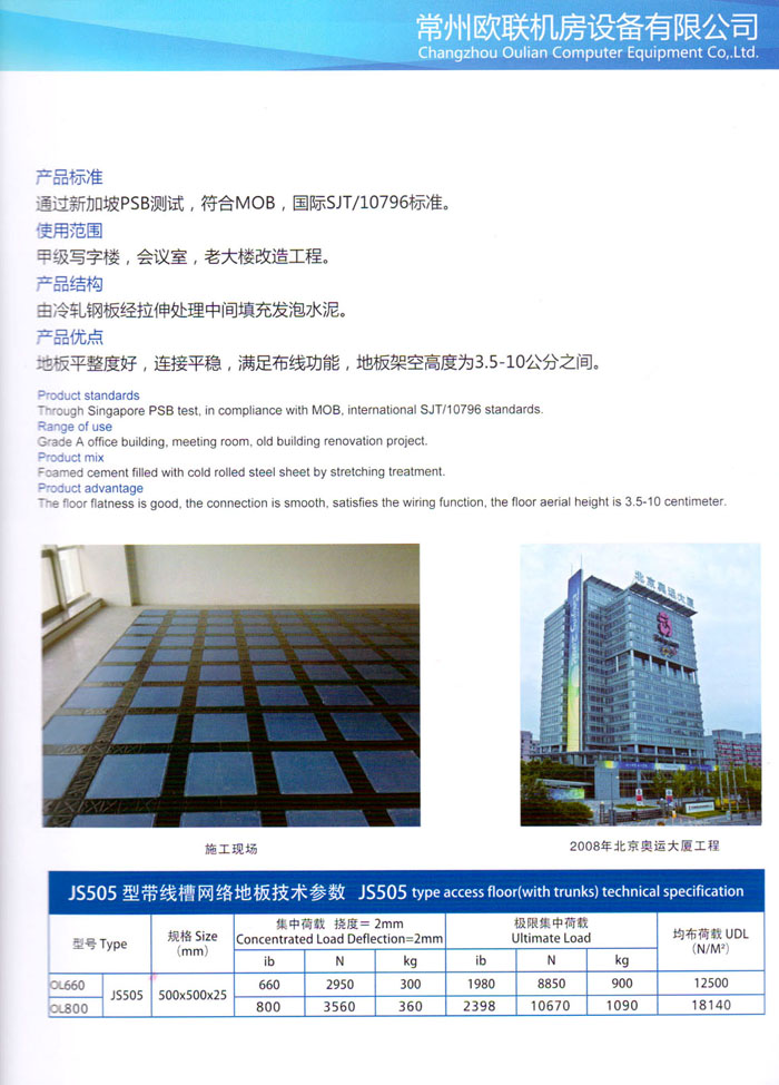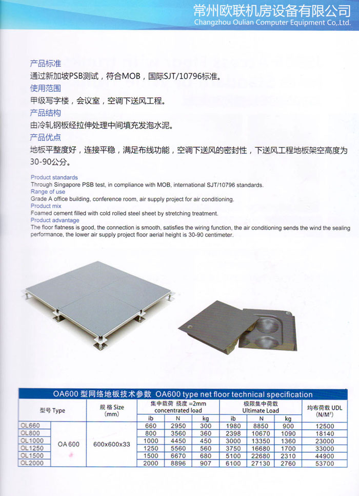 防靜電高架活動(dòng)地板、全鋼地板、陶瓷地板是計(jì)算機(jī)行業(yè)發(fā)展起來(lái)的新型鋪地材料,隔離了潮氣、靜電灰塵,最重要的是解決了綜合布線問(wèn)題,無(wú)需預(yù)埋管線,可隨時(shí)拆卸、搬移,保證了資訊設(shè)備完整的優(yōu)點(diǎn),適應(yīng)了智能化樓宇中信息自動(dòng)化技術(shù)對(duì)所處環(huán)境的特定要求,避免了廣大客戶的雙重投資,使現(xiàn)代化辦公程度更加高效,辦公場(chǎng)所更加舒適。 “歐聯(lián)”系列全鋼地板,符合國(guó)家安全要求,種類完備多樣,其中防靜電陶瓷地板、硫酸鈣地板等除具有普通瓷質(zhì)的裝飾和實(shí)用性外,其耐磨、防水、防火功能優(yōu)于其它同類產(chǎn)品,防靜電系列地板,能切合不同客戶的要求,其靈活的配置,深受客戶歡迎,不同材質(zhì)的地板結(jié)構(gòu)使設(shè)計(jì)師的設(shè)計(jì)空間比傳統(tǒng)的更加廣闊自由和善變。 公司大力發(fā)展國(guó)內(nèi)外銷售業(yè)務(wù),多次中標(biāo)國(guó)內(nèi)重點(diǎn)工程 ,例:哈爾濱醫(yī)科大學(xué)、山東大學(xué)、上海普通機(jī)場(chǎng)等。 公司將一如既往開(kāi)發(fā)和制造一流的產(chǎn)品,愿與廣大有識(shí)之士合作發(fā)展,共創(chuàng)美好未來(lái)。