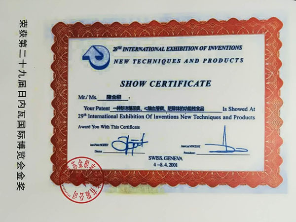本產(chǎn)品原料是在高寒、高濕、旱地等種植,要求施農(nóng)家肥,采用生物治蟲,因此是無公害的優(yōu)良品種。目前公司有四個種植基地,分別在江西、江蘇、陜西等地。 一種防治糖尿病功能性食品專利號:ZL99119217.6。 “程金根”系列產(chǎn)品先后獲得二項發(fā)明專利,并經(jīng)聯(lián)合國科技成果評估論證為A級產(chǎn)品,屬世界領(lǐng)先技術(shù)。在韓國、美國、香港、德國分別榮獲新技術(shù)、新產(chǎn)品博覽會金獎。