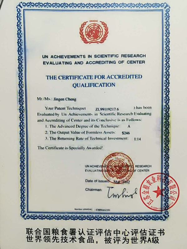 2006年經(jīng)國家農(nóng)業(yè)部、發(fā)展改革委員會、聯(lián)合國糧農(nóng)組織代表、中醫(yī)研究院、中國科學(xué)技術(shù)協(xié)會、中醫(yī)藥大學(xué)、農(nóng)業(yè)大學(xué)、農(nóng)學(xué)院、中國保健協(xié)會、糧油協(xié)會、食品研究所等十幾位專家對該專利產(chǎn)品做了評估論證,一致認為該項技術(shù)先進產(chǎn)品突出、食用安全,并給予很高的評價。 論證意見: 1、這項專利技術(shù)填補了國內(nèi)糖尿病特種功效食品的專用品種和栽培技術(shù)空白。 2、采用有機食品技術(shù),并以有機農(nóng)產(chǎn)品為原料加工特種營養(yǎng)食品,提高了產(chǎn)品的安全性。 3、用鉻、硒、鋅、鎂、鋰生物強化栽培技術(shù)已獲得發(fā)明專利,為國際先進水平。 4、經(jīng)過10多年的應(yīng)用實踐,進一步證明了通過飲食調(diào)理,可預(yù)防糖尿病,對已患糖尿病者有緩解和預(yù)防糖尿病綜合癥的功效。