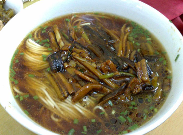 常州新北區(qū)孟河公陽小吃店從事鱔絲面23年,經(jīng)營面積100平方米,黃鱔全是野生,面湯采用高湯制作(鱔魚湯),下面的時候先用開水把黃鱔燙熟,然后用竹刀批下二條黃鱔肉,除去骨頭肚腸,切成段后入油鍋里炸酥,再用白湯烹制成為面澆頭。而面湯是用鱔魚骨頭、豬骨等用大鍋猛火煮上三、四個鐘頭,成為一鍋濃濃的白湯,再進行調味,吃到嘴里全身舒坦。