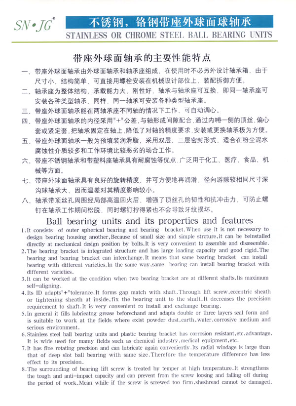 常州市武進蘇南軸承有限公司是生產(chǎn)鋼球及帶座外球面軸承的專業(yè)工廠,主要生產(chǎn)蘇南牌“SN”不銹鋼球、鉻鋼鋼球,以及不銹鋼、鉻鋼UC、UCX、UK、HC、SB、SA、SER、UOOO、KOOO及其它非標(biāo)系列各類帶座外球面軸承、偏心套、緊定套等產(chǎn)品。本廠生產(chǎn)規(guī)格有軸承鋼球0.5-150m/m,碳鋼球0.5-150m/m,不銹鋼球0.8-50m/m,同時定做各種特殊規(guī)格的不銹鋼球、銅球、陶瓷球等。為廣大用戶提供品質(zhì)優(yōu)良,規(guī)格齊全,價格合理的各種鋼球。 本公司位于常州南部,錫宜高速公路串境而過, 交通便利。南瀕風(fēng)景秀麗的太湖,沿湖丘陵地帶人文景觀豐富,為常州市武進區(qū)太湖旅游度假區(qū) 。本廠環(huán)境優(yōu)美,具有良好的生產(chǎn)環(huán)境,我們竭誠歡迎國內(nèi)外的朋友進行廣泛多樣的經(jīng)濟合作交往和貿(mào)易合作,并為你提供優(yōu)良的服務(wù)。 本公司技術(shù)力量雄厚,工藝裝備先進,檢測手段完備,產(chǎn)品質(zhì)量穩(wěn)定,使用性能各項指標(biāo)都達(dá)到國際先進水平,產(chǎn)品主要銷往美國、法國、德國、日本、意大利、澳大利亞、韓國、加拿大、及東南亞等國家和地區(qū)。本公司的“SN”商標(biāo)鋼球及帶座外球面軸承已贏得國內(nèi)外廣大用戶的信賴。 本公司具有外貿(mào)自營出口權(quán),并于2002年9月通過ISO9001-2000版質(zhì)量體系認(rèn)證,于2004年8月通過“CQC”產(chǎn)品質(zhì)量認(rèn)證。
