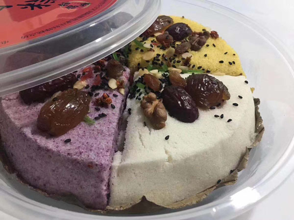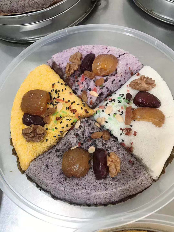 腳踏糕本名“年糕”,按常州周邊地區(qū)的風(fēng)俗習(xí)慣,在春季前夕,各家各戶都要蒸年糕,吃年糕。“糕”諧音“高”,過年吃年糕被賜予“年年高”,一年高一年,鋒吉祥之意,表達(dá)這人們對未來美好生活的憧憬和良好的祝愿。今天小編要帶大家的就是一家至今保持著傳統(tǒng)手工制作的鈺鋒糕點(diǎn)坊。 鈺鋒糕點(diǎn)坊位于常州鄭陸鎮(zhèn)三皇廟范家莊,一個比較偏僻的村莊,雖然這家作坊不大,但香糯絲滑,軟糯適中,韌勁十足的腳踏糕吸引了無數(shù)的食客。制作一條腳踏糕要從淘米,浸泡,碾粉,鋪粉,一層一層的鋪下去,需要無數(shù)道制作工序,這些都是店主孫煥公公老周,憑著幾十年的經(jīng)驗(yàn),加上店主孫煥從不馬虎的決心! 這“腳踏”也并非赤腳上陣,而是把蒸好的糕倒入早以準(zhǔn)備好的框子里,用布包裹好,上面再用薄膜包好,再蓋上布,再換上專門腳踏的布鞋,踩的時候要勻稱,左右腳要配合好,不然糕會高高低低,不平整,最后再拿蠟燭線拆成一條小長條,再拿帶包裝好,如此又香又糯的腳踏糕就大功告成了。 店主孫煥為了讓更多的人認(rèn)識和了解常州腳踏糕的傳統(tǒng)文化和美食,她在傳統(tǒng)工藝中增加了適合現(xiàn)代文化的多種口味,她在糕里加入南瓜,紫薯,老紅糖,大麥汁,血糯米,核桃,葡萄干,紅棗等食材,做出五顏六色,純天然的口味,深受食客們的喜愛,不管是送人還是自己吃都非常新穎。 (重陽糕)重陽糕的由來,九九重陽,九是陽數(shù),也是陽數(shù)中最大的數(shù),九月初九,兩九相重,為之重陽,古人有重陽登高的習(xí)俗。高于糕同意,寓意人活九十九,生活步步高,秋景勝春光,夕陽無限好。夕陽紅成了老人對自己美好的祝愿和希望,所以從某種意義上來講它“祝壽糕”“長壽糕”重陽糕在常州地區(qū)是家喻戶曉的,下面小編帶你去一家至今保持傳統(tǒng)手工制作的鈺鋒糕點(diǎn)坊看一下吧。鈺鋒糕點(diǎn)坊位于常州市天寧區(qū)鄭陸鎮(zhèn)三皇廟范家莊,偏僻的小村莊,雖然有點(diǎn)偏僻,但是每到重陽節(jié)到來,每天還是有很多食客來訂購和購買店主孫煥做的多種口味的重陽糕。要想做出松軟香糯的重陽糕,原材料和糯米和梗米的配比也很重要,調(diào)整好比例開始淘米,浸泡,釓粉,放入糖攪拌,篩粉,糕底部放上荷葉,中間的餡心都是孫煥自己熬制,口感,香糯松軟,店主孫煥為了吸引更多現(xiàn)代年輕人,她在粉里加入南瓜,紫薯,紅糖,血糯等,色彩搭配很出跳,吸引來了很多食客,孫煥2019年開始自愿捐贈重陽糕給敬老院,她說這樣的公益活動自己很喜歡,雖然金額不大,缺表達(dá)了她的一份心意,并稱這樣的公益活動她每年都會做。