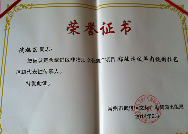 談家的羊肉館位于鄭陸老街上,深秋的一天,記者來到這家羊肉館,穿過大堂走到廚房里,幾名工人正在忙著處理羊肉。余菊華穿著大紅色的薄毛衣,坐在桌子旁,正在麻利地剔著羊肉上的肥油。她是羊肉館的老一代老板娘,如今和老伴談仲興一起,仍天天來店里幫著兒子談旭東打下手。余阿姨隨手拿過一塊長(zhǎng)方形的肉皮,用一把小刮刀撳在上面,輕輕地刮著,一團(tuán)團(tuán)白白的油被剔了下來,堆在一邊!拔壹业难蛉馀酶蓛舻模壬系姆嗜膺有筋筋拉拉的東西,全都要弄掉,就是自己家買了豬肉燒紅燒肉,也不可能弄到這么干凈的,F(xiàn)在的客人都怕胖,所以一定要處理得干干凈凈。”余阿姨說。剔好的肉皮是用來熬成皮凍然后混和著羊肉壓制成羊糕的,只有清理得干凈,沒有一點(diǎn)雜質(zhì),羊糕的質(zhì)量才會(huì)好。