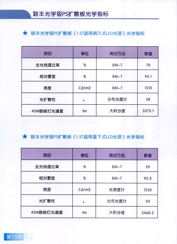 常州市聯(lián)豐(鏡面輥)集團(tuán)成立于2000年,是國(guó)內(nèi)從事板片材行業(yè)輥筒制造的專業(yè)企業(yè)。聯(lián)豐集團(tuán)全資子公司常州市聯(lián)豐光電科技有限公司成立于2013年6月。聯(lián)豐光電專業(yè)從事光學(xué)級(jí)擴(kuò)散板的研發(fā),生產(chǎn)和銷售。擁有各類高級(jí)技術(shù)研發(fā)人員10人,生產(chǎn)、管理及銷售人員60人。公司廠房占地面積2萬(wàn)平方米,工廠擁有十萬(wàn)級(jí)凈化車間,能有效滿足光學(xué)領(lǐng)域擴(kuò)散板生產(chǎn)的環(huán)境要求。公司已經(jīng)申報(bào)江蘇省高新技術(shù)企業(yè)。 公司現(xiàn)擁有全新進(jìn)口PS專用擴(kuò)散板材生產(chǎn)線兩條,月生產(chǎn)能力650噸PS擴(kuò)散板。日本進(jìn)口協(xié)榮裁切一體機(jī)兩臺(tái),月加工能力50萬(wàn)片(32寸擴(kuò)散板)。 聯(lián)豐生產(chǎn)的VFP系列PS擴(kuò)散板能廣泛應(yīng)用于直下式LED,CCFL液晶電視背光模組。產(chǎn)品在很多國(guó)內(nèi)一線TV的背光模組上使用。產(chǎn)品具有高輝度,高擴(kuò)散性,特別適用于超薄背光模組的擴(kuò)散部件,能有效降低成本,節(jié)約能源。 由于LED照明行業(yè)的興起,公司特別針對(duì)于LED面板燈和筒燈開(kāi)發(fā)的LFP系列擴(kuò)散板,在滿足透光率條件下,能最大限度提高光通量,從而增加燈具的光效,受到廣大客戶的好評(píng)。