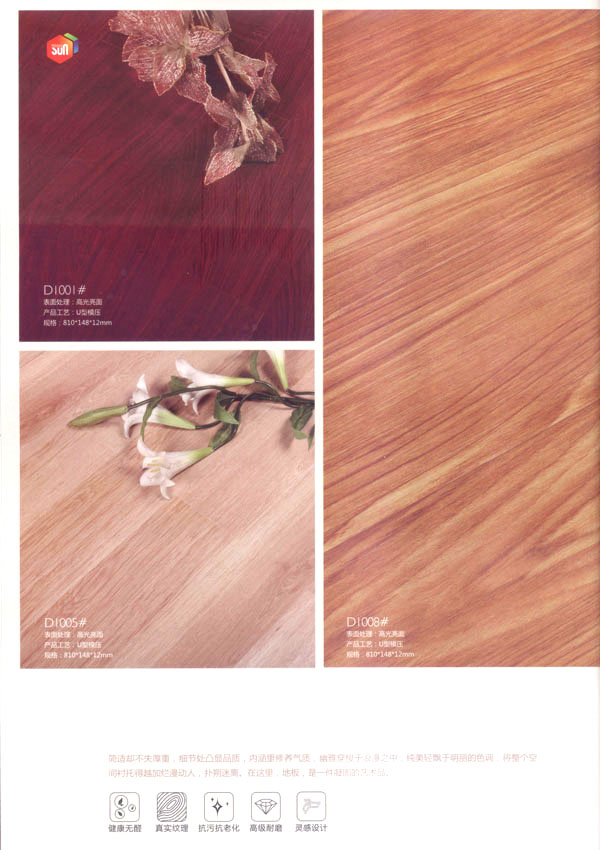 品牌保證,質(zhì)量放心 公司旗下“霞光.旭日”品牌地板系列由旭日皇家、旭日經(jīng)典、旭日戀家、至尊奢華、巧奪天工、水晶陶瓷等幾個系列構(gòu)成,配有專職質(zhì)量檢驗人員,嚴(yán)把產(chǎn)品質(zhì)量關(guān),不斷完善產(chǎn)品質(zhì)量體系、監(jiān)控管理體系。公司對客戶需求全面、科學(xué)、準(zhǔn)確地把握,確保對客戶市場適時高效反應(yīng)。一流的設(shè)備、精心的選材、完美的工藝以及對產(chǎn)品品味不倦的追求,令奔公司產(chǎn)品獨樹一幟。