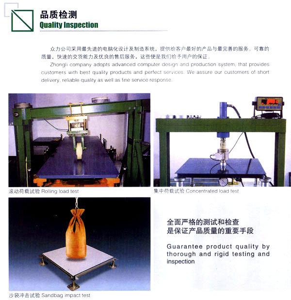 公司生產(chǎn)防靜電鋼質(zhì)、木質(zhì)機(jī)房地板和強(qiáng)化復(fù)合地板及各種電腦操作臺(tái)系列產(chǎn)品。該產(chǎn)品廣泛應(yīng)用于電子機(jī)房、通訊機(jī)房、各類實(shí)驗(yàn)室和管線鋪設(shè)集中的防靜電場所以及家庭、大型商場的裝飾。公司技術(shù)力量雄厚、管理科學(xué),已具有設(shè)計(jì)、開發(fā)、市場營銷及售后服務(wù)的專業(yè)人才隊(duì)伍。