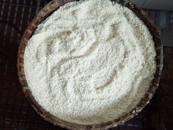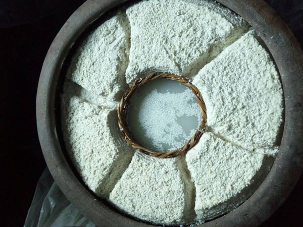 第三步:拌入酒曲,這時候才發(fā)現(xiàn)了“木桶”的神奇之處:一頭空,另一頭也是空,只不過用鋼筋做了個柵欄。之前蒸米飯,老徐是墊上了蒲草,一方面讓糯米飯更易熟,另一方面也增加了糯米飯的清香氣息。把糯米飯倒入蠶匾中,邊翻動糯米飯邊撒上酒曲,使酒曲與糯米飯充分拌勻。