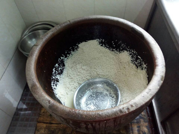 第二步:冷卻降溫,糯米蒸熟后,用冷水淋沐,直至糯米飯溫度降到35℃左右。要知道這個溫度非常關(guān)鍵,太冷了會影響之后酒曲發(fā)酵,溫度太高會把酒曲中的酵母殺死。不靠溫度計,老徐靠得完全是自己多年的經(jīng)驗。
