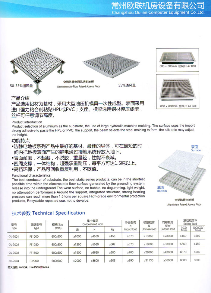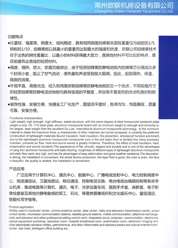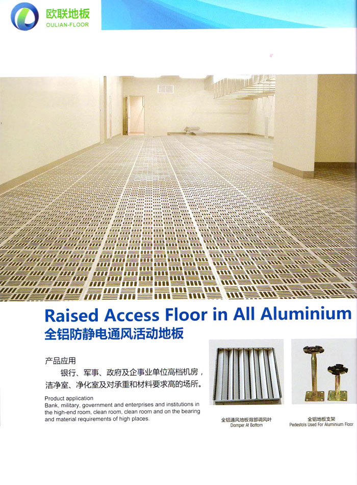 防靜電高架活動(dòng)地板、全鋼地板、陶瓷地板是計(jì)算機(jī)行業(yè)發(fā)展起來(lái)的新型鋪地材料,隔離了潮氣、靜電灰塵,最重要的是解決了綜合布線問(wèn)題,無(wú)需預(yù)埋管線,可隨時(shí)拆卸、搬移,保證了資訊設(shè)備完整的優(yōu)點(diǎn),適應(yīng)了智能化樓宇中信息自動(dòng)化技術(shù)對(duì)所處環(huán)境的特定要求,避免了廣大客戶的雙重投資,使現(xiàn)代化辦公程度更加高效,辦公場(chǎng)所更加舒適。 “歐聯(lián)”系列全鋼地板,符合國(guó)家安全要求,種類完備多樣,其中防靜電陶瓷地板、硫酸鈣地板等除具有普通瓷質(zhì)的裝飾和實(shí)用性外,其耐磨、防水、防火功能優(yōu)于其它同類產(chǎn)品,防靜電系列地板,能切合不同客戶的要求,其靈活的配置,深受客戶歡迎,不同材質(zhì)的地板結(jié)構(gòu)使設(shè)計(jì)師的設(shè)計(jì)空間比傳統(tǒng)的更加廣闊自由和善變。 公司大力發(fā)展國(guó)內(nèi)外銷售業(yè)務(wù),多次中標(biāo)國(guó)內(nèi)重點(diǎn)工程 ,例:哈爾濱醫(yī)科大學(xué)、山東大學(xué)、上海普通機(jī)場(chǎng)等。 公司將一如既往開發(fā)和制造一流的產(chǎn)品,愿與廣大有識(shí)之士合作發(fā)展,共創(chuàng)美好未來(lái)。