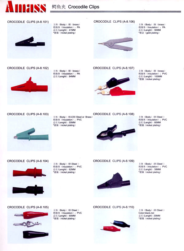 本公司專業(yè)生產(chǎn)各類香蕉插頭,香蕉插座,接線柱,電瓶夾,鱷魚夾,測試導(dǎo)線,測試筆等。產(chǎn)品分2mm/2.5mm/3mm/3.5mm/4mm五大系列,百余種款式, 各種香蕉插廣泛用于儀器、儀表、電力測試、教學(xué)、玩具,視聽設(shè)備、醫(yī)療儀器,保健產(chǎn)品等領(lǐng)域。公司技術(shù)力量雄厚,生產(chǎn)工藝先進(jìn),產(chǎn)品遠(yuǎn)銷港、臺、歐美,并與飛利浦等國際品牌配套。公司本著精益求精的理念,歡迎新老客戶光臨。 我們擁有資深的工程師和豐富的電子產(chǎn)品銷售經(jīng)驗,專業(yè)生產(chǎn)各類電子接插件產(chǎn)品。 香蕉插頭,香蕉插座,電瓶夾,鱷魚夾等品種齊全、 質(zhì)量可靠,致力服務(wù)于通訊、數(shù)據(jù)通信、消費類電子產(chǎn)品、計算機和計算機外圍設(shè)備以及工業(yè)應(yīng)用等領(lǐng)域,能給客戶提供全面采購解決方案。 我們秉承穩(wěn)健作風(fēng)、誠實經(jīng)營、合理價格、完善服務(wù)的宗旨,在全體客戶的支持下,公司不斷創(chuàng)新進(jìn)取,業(yè)績蒸蒸日上,已與數(shù)十家電子零件制造商及其分支機構(gòu)建立密切合作關(guān)系,在國內(nèi)擁有數(shù)百家固定客戶。