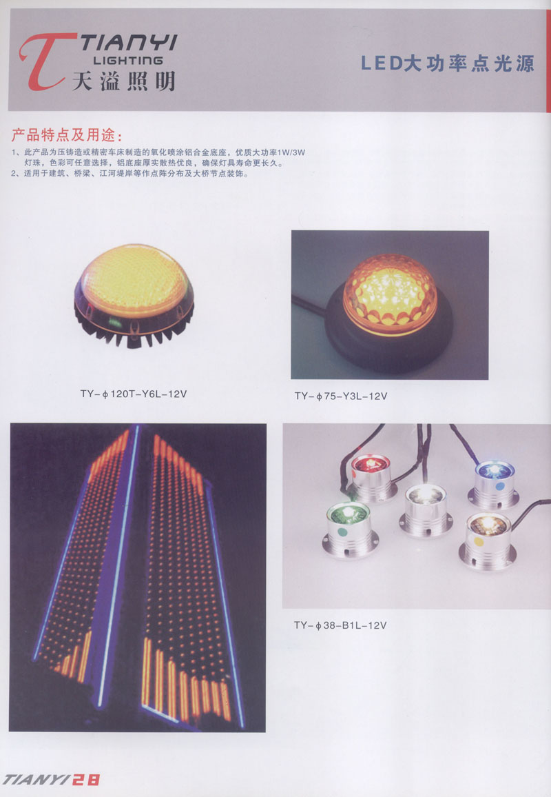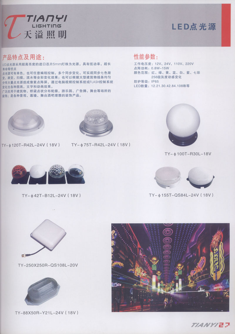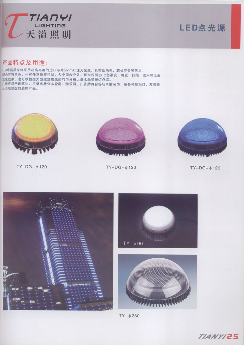 天溢照明是中國(guó)領(lǐng)先的專業(yè)從事LED廣告照明裝飾燈具設(shè)計(jì)、系統(tǒng)開發(fā)、燈具制造、工程服務(wù)一體的專業(yè)型公司,本公司產(chǎn)品已廣泛應(yīng)用于全國(guó)大多數(shù)城市夜景亮化景觀照明、酒店休閑娛樂夜場(chǎng)夢(mèng)幻燈光、戶內(nèi)外廣告宣傳、建筑及室內(nèi)照明以及家居裝飾等場(chǎng)合。