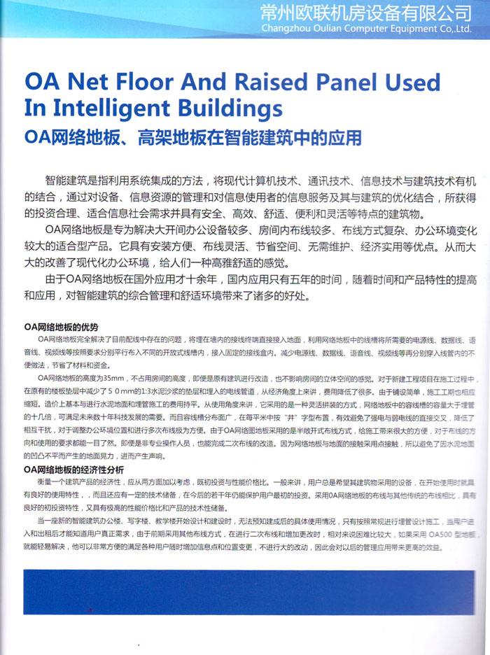 防靜電高架活動地板、全鋼地板、陶瓷地板是計算機行業(yè)發(fā)展起來的新型鋪地材料,隔離了潮氣、靜電灰塵,最重要的是解決了綜合布線問題,無需預埋管線,可隨時拆卸、搬移,保證了資訊設備完整的優(yōu)點,適應了智能化樓宇中信息自動化技術對所處環(huán)境的特定要求,避免了廣大客戶的雙重投資,使現(xiàn)代化辦公程度更加高效,辦公場所更加舒適。 “歐聯(lián)”系列全鋼地板,符合國家安全要求,種類完備多樣,其中防靜電陶瓷地板、硫酸鈣地板等除具有普通瓷質的裝飾和實用性外,其耐磨、防水、防火功能優(yōu)于其它同類產(chǎn)品,防靜電系列地板,能切合不同客戶的要求,其靈活的配置,深受客戶歡迎,不同材質的地板結構使設計師的設計空間比傳統(tǒng)的更加廣闊自由和善變。 公司大力發(fā)展國內(nèi)外銷售業(yè)務,多次中標國內(nèi)重點工程 ,例:哈爾濱醫(yī)科大學、山東大學、上海普通機場等。 公司將一如既往開發(fā)和制造一流的產(chǎn)品,愿與廣大有識之士合作發(fā)展,共創(chuàng)美好未來。