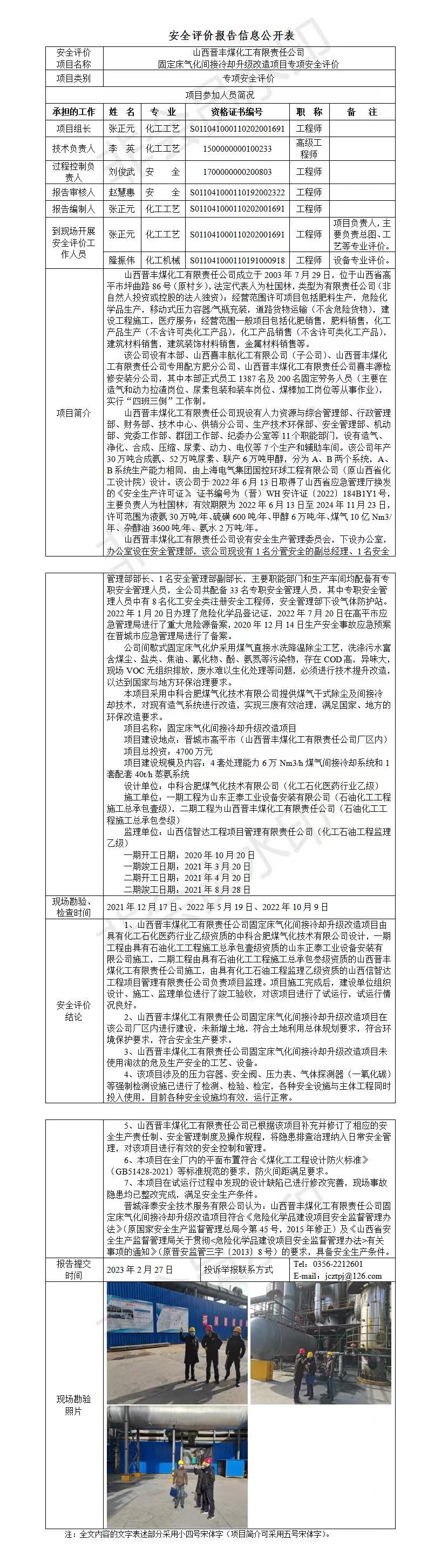 山西晉豐煤化工有限責(zé)任公司固定床氣化間接冷卻升級(jí)改造項(xiàng)目專項(xiàng)安全評(píng)價(jià)