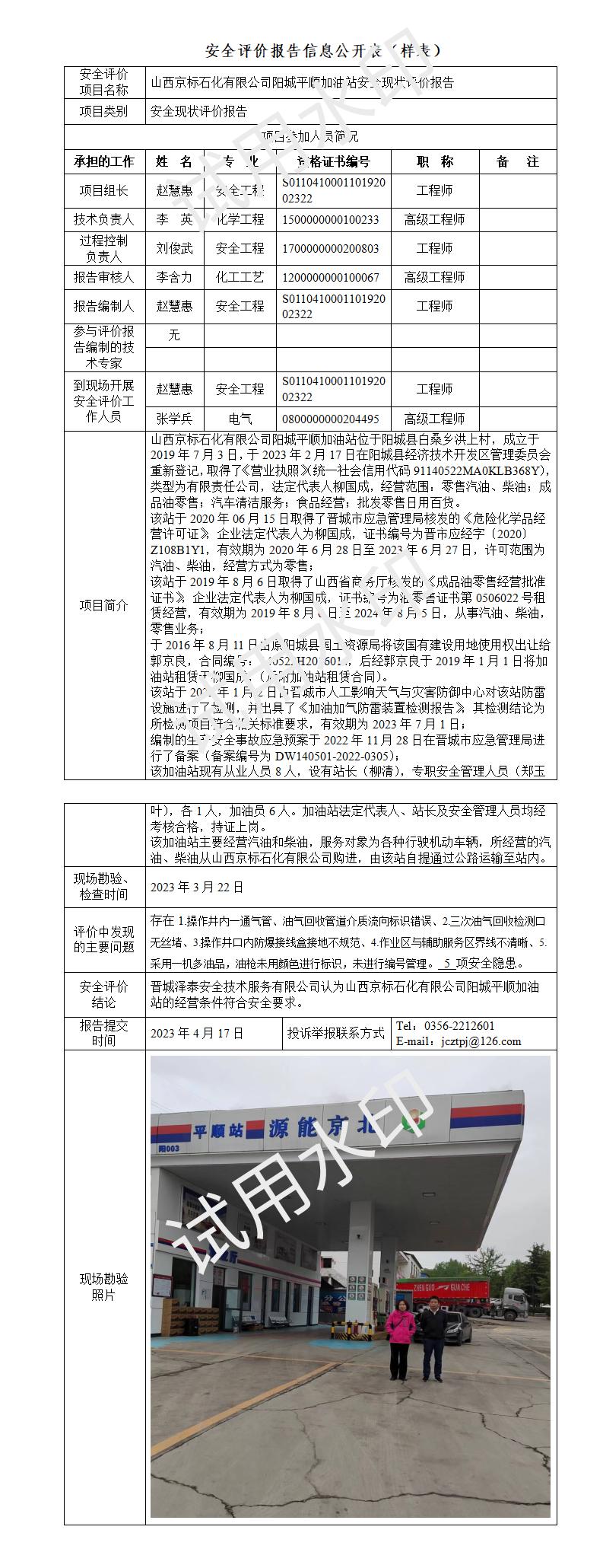 山西京標石化有限公司陽城平順加油站安全現(xiàn)狀評價報告