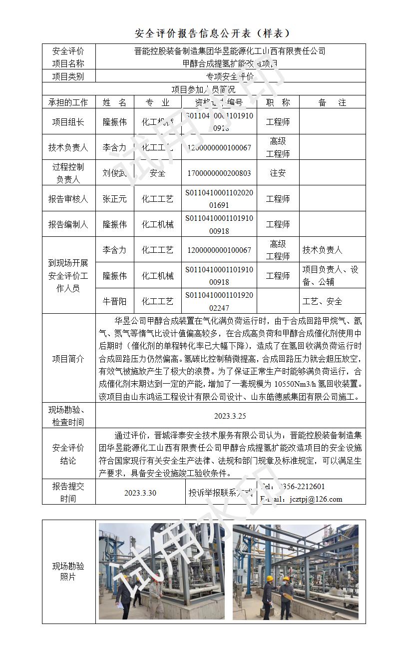 晉能控股裝備制造集團(tuán)華昱能源化工山西有限責(zé)任公司甲醇合成提氫擴(kuò)能改造項(xiàng)目
