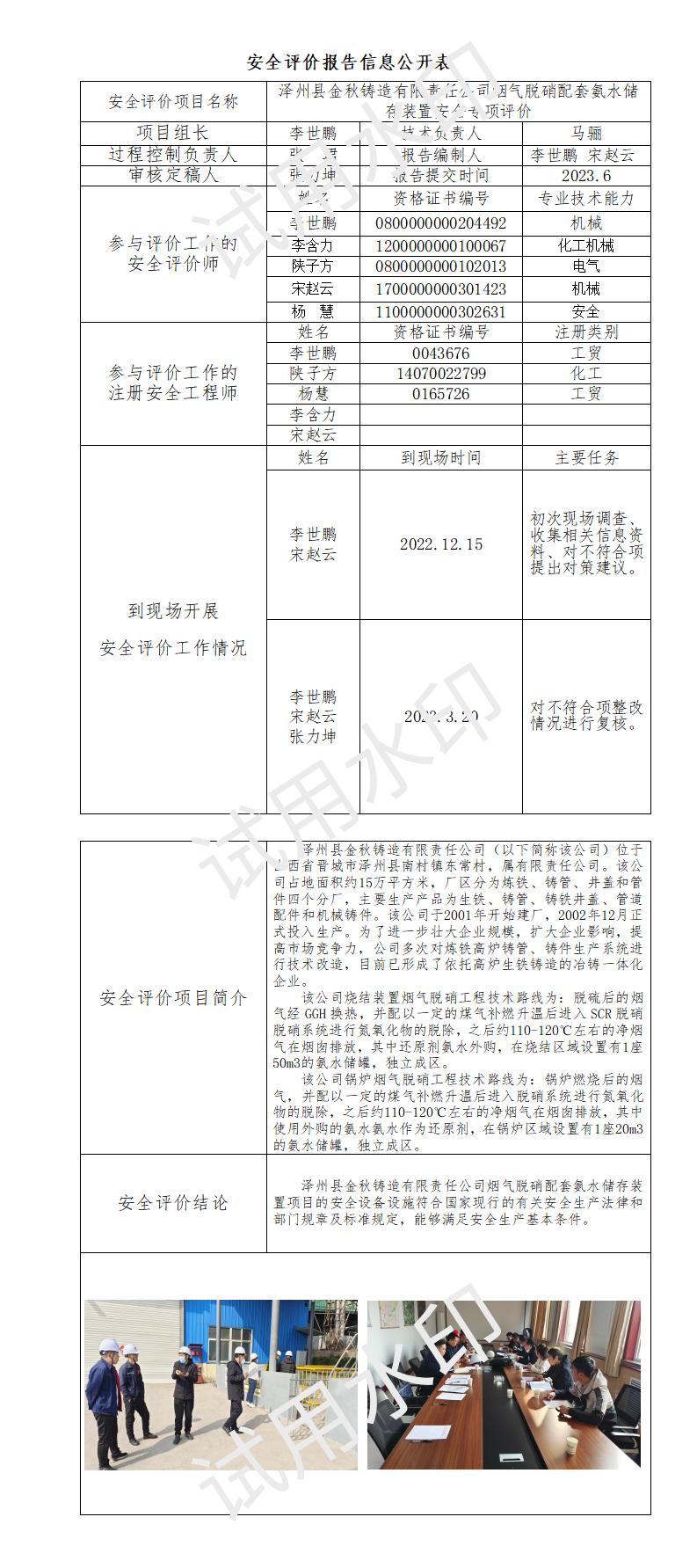 澤州縣金秋鑄造有限責(zé)任公司煙氣脫硝配套氨水儲(chǔ)存裝置安全專項(xiàng)評(píng)價(jià)