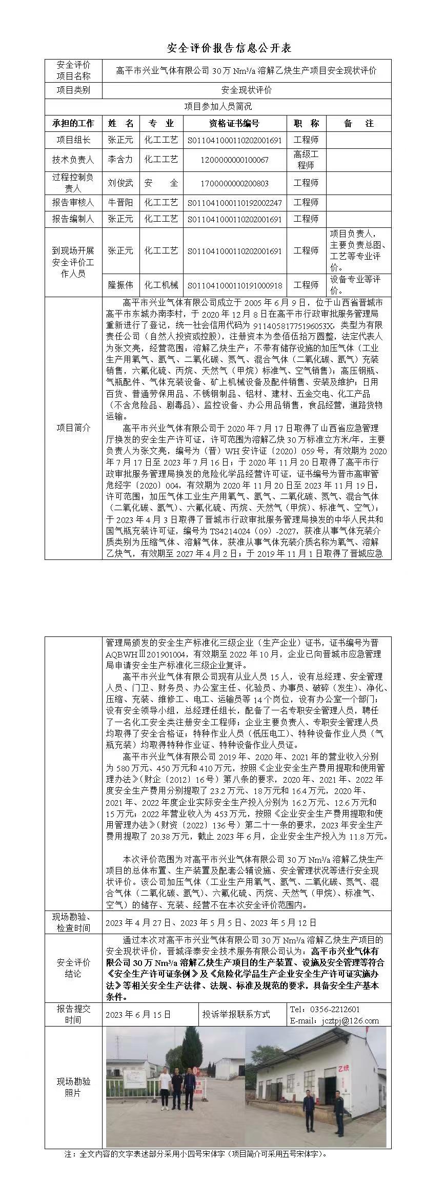 高平市興業(yè)氣體有限公司30萬Nm3/a溶解乙炔生產(chǎn)項目安全現(xiàn)狀評價報告