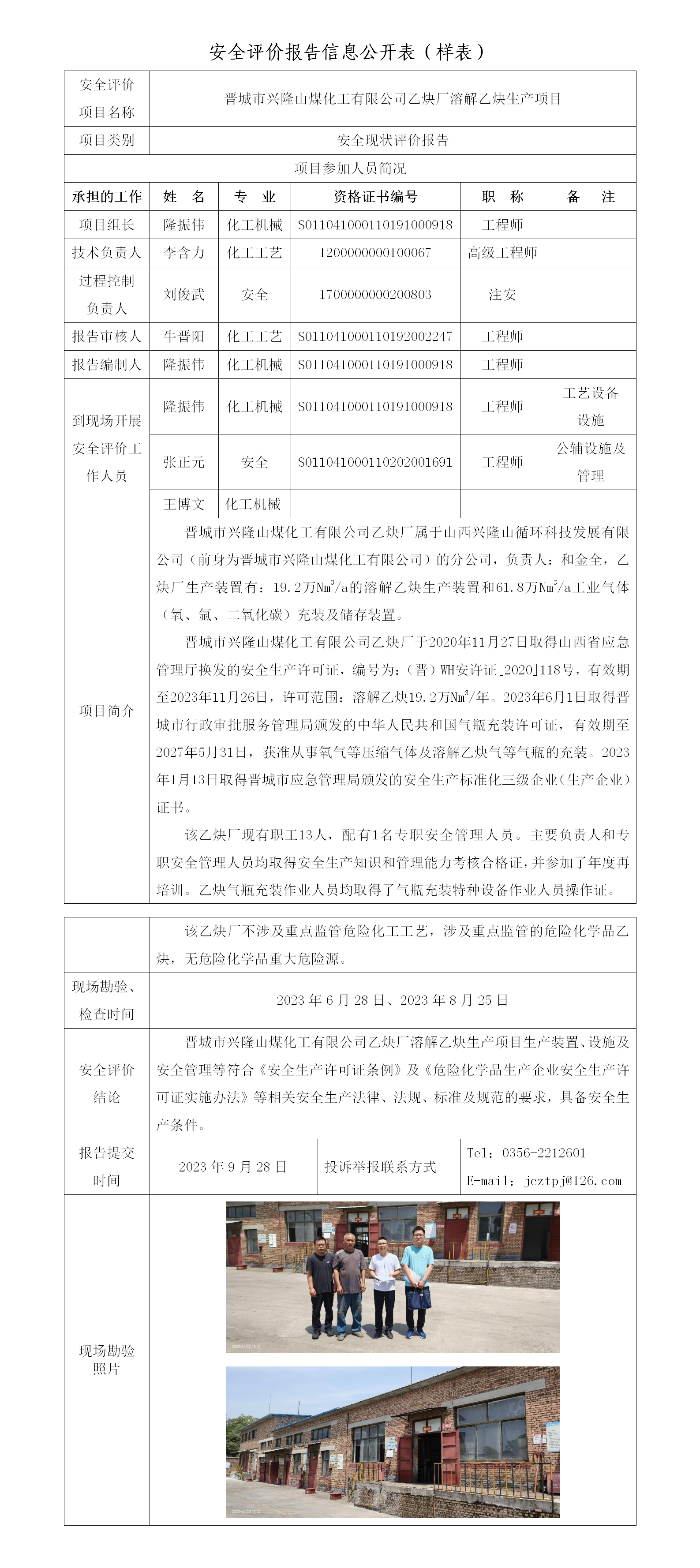 晉城市興隆山煤化工有限公司乙炔廠溶解乙炔生產(chǎn)項目