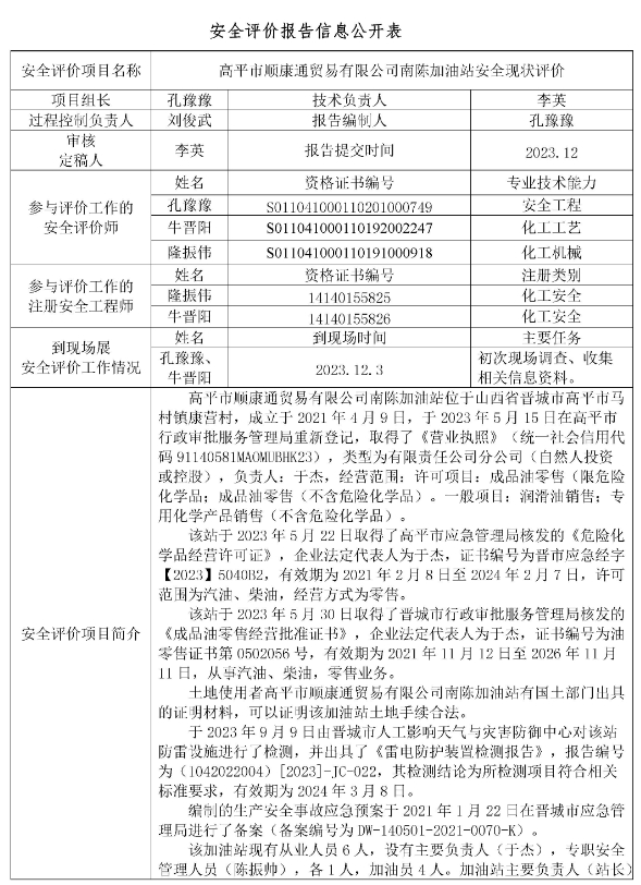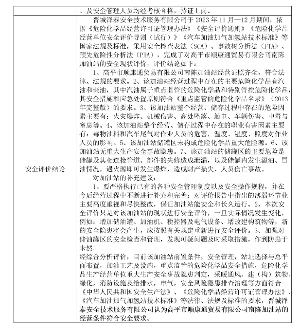 高平市順康通貿易有限公司南陳加油站安全現(xiàn)狀評價